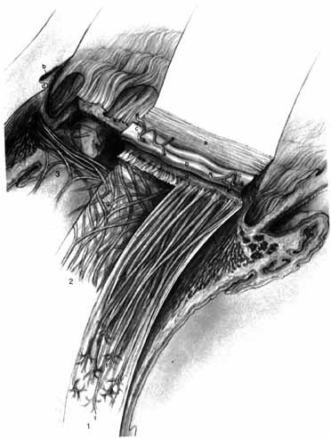 The insertion of the superior oblique muscle is beneath the anterior portion of the superior rectus muscle. It has a wide curvilinear tendinous insertion that faces posterolaterally and is convex in that direction. The width of the insertion varies between 7 and 18 mm. The anterior and lateral edge of the tendon is just anterior to the geometric equator of the globe, approximately 12 to 14 mm (average, 13.8 mm)23 posterior to the limbus, only a few millimeters (3–4.5 mm)23 posterior to the lateral insertion of the superior rectus tendon, and close to the lateral edge of the superior rectus muscle. The majority of the tendon is posterior to the geometric equator. The medial and posterior edge of the tendon approximately 17 to 19 mm (average, 18.8 mm) posterior to the limbus and as much as 14 mm (average, 13.6 mm) posterior to the medial insertion of the superior rectus tendon. This edge of the tendon is approximately 8 mm superior to the posterior pole of the globe. The superolateral vortex vein is only a few millimeters posterior to the medial insertion of the superior oblique tendon and very close to the lateral edge of the superior rectus muscle. The inferior oblique muscle has a very short or absent tendon at its insertion into the sclera. This insertion is inferior to the horizontal meridian and lateral to the sagittal meridian, placing it in the inferior lateral quadrant of the posterior aspect of the globe. The insertion is convex in the superior direction and measures 5 to 14 mm in length. At its most posterior point, the insertion is 3 to 6 mm lateral to the lateral aspect of the optic nerve and approximately 1 mm below and 1 to 3 mm (average, 2.2 mm) temporal to the macula.24 The most anterior aspect of its insertion is approximately 10 mm posterior to the midpoint of the lateral rectus muscle insertion. The posterior edge of the insertion and the muscle are only a few millimeters anterior to the inferolateral vortex vein. |