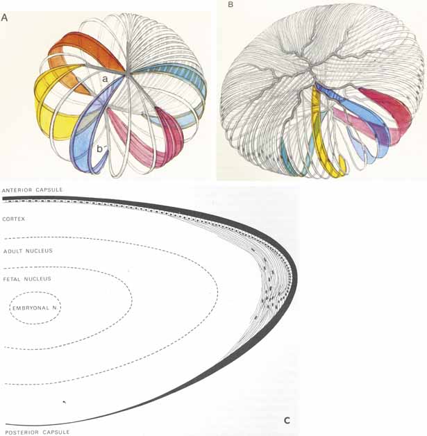 The lens is composed of three parts: (1) an elastic capsule; (2) a lens epithelium; and (3) the lens fibers (Fig. 17). The capsule is a thick elastic basement membrane that envelops the entire lens. The anterior surface is thicker than the posterior surface and increases in thickness throughout life. Thickness increases toward the equator on both anterior and posterior surfaces, measuring 20 μm, but not at the equator itself. The capsule is thinnest at the posterior pole, measuring approximately 3 μm. On either side of the lens equator, suspensory ligaments, or zonules, arising from the ciliary body support the lens laterally by attaching to the lens capsule over an area 2.5 mm in width. The zonules extend in two sheet-like layers, one posteriorly from the bays of the pars plana and the other anteriorly from the valleys between the ciliary processes and from the sides of these processes to the lens.99–102,114 As these fibers attach onto the lens capsule, they spread out in a “brush-like” expansion. Relaxation of accommodation places the zonules under tension. This tents up the otherwise smooth lens capsule in those areas where the zonules are attached. The fibers themselves are composed of minute fibrillae measuring 8 to 12 nm in diameter. There is also a granular component consisting of mucopolysaccharide and protein associated with these zonules. The zonules are mucin-covered and birefringent, forming a sheet-like membrane because of the associated mucus. Approximately 140 large zonular fiber bundles are present circumferentially to support the lens. The epithelium of the lens is present beneath the anterior capsule and equatorial region of the lens. There is no epithelium under the posterior capsule. The apices of the lens epithelium face the lens capsule. The epithelial cells under the anterior lens capsule measure approximately 5 to 8 μm in height and 11 to 17 μm in width. They are almost cuboidal in shape and have round nuclei displaced slightly toward the lens cortex. The epithelial cells between the anterior portion and equatorial portions of the lens are more cylindrical. Mitoses are present in this area, and the nuclei are more centrally placed. At the equator, they become transformed into lens fibers.9 The lens fibers comprise the main mass of the lens. At the equator, the epithelial cells are long, ribbon-like, and extend backward along the inner surface of the lens capsule. Anteriorly, these cells extend under their adjacent neighbor. The nuclei of these cells are flattened and eventually disappear as cells are pushed in toward the cortex and incorporated into the lens cortex as lens fibers. The fibers are U-shaped and run meridionally from the anterior to the posterior lens surface. The total number of lens cells in the adult has been estimated to be between 2100 and 2300. The cortical cells measure 8 to 12 mm in length, 7 μm in width, and 4.6 μm in thickness. Cells as thin as 2 μm have been measured in the lens cortex. A cross-section of the lens demonstrates the presence of what appears to be a bow-shaped arrangement of cell nuclei extending from the equator anteriorly. Anteriorly and posteriorly, the lens cells terminate at the lens sutures. These sutures form an erect Y shape anteriorly and an inverted Y shape posteriorly. The anterior suture is formed by the interdigitation of the apical processes of the lens cells. The posterior suture is formed by the interdigitation of the basal processes of the lens cells. The lens continues to accumulate cells throughout life, such that the central portion of the lens, or nucleus, becomes less pliable, more compact, sclerosed, and yellow. The increased density eventually reduces visual acuity. In addition to this nuclear sclerosis, the lens can become opaque because of a variety of other factors, including disorganization of fiber membranes or of lens proteins and accumulation of colored, insoluble proteins in the lens.115 |