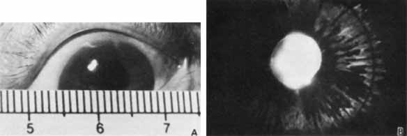 syndrome.158 Corneal dermoids are present at birth and may enlarge at puberty. They can be either unilateral or bilateral and have no sex predilection. These tumors are discrete, slightly elevated, and white–yellow (Fig. 27). They may also be rimmed by a lipid stromal infiltrate, separated from it by a clear zone. Central corneal dermoids obscuring the visual axis can cause dense amblyopia, whereas more limbal dermoids can cause irregular astigmatism. These choristomas can vary from a small, flat limbal spot to involvement of the entire anterior segment. When the dermoid is straddling the limbus and has short hairs protruding from its surface, the diagnosis is straightforward. However, an isolated dermoid occupying the central cornea should be evaluated with transillumination of the globe to clarify the diagnosis. A central corneal dermoid, as well as a corneal keloid, will block the light, whereas a staphyloma will transmit the light. Further study of the anterior segment anatomy can be performed with A-scan or B-scan ultrasonography performed through a water bath or magnetic resonance imaging.