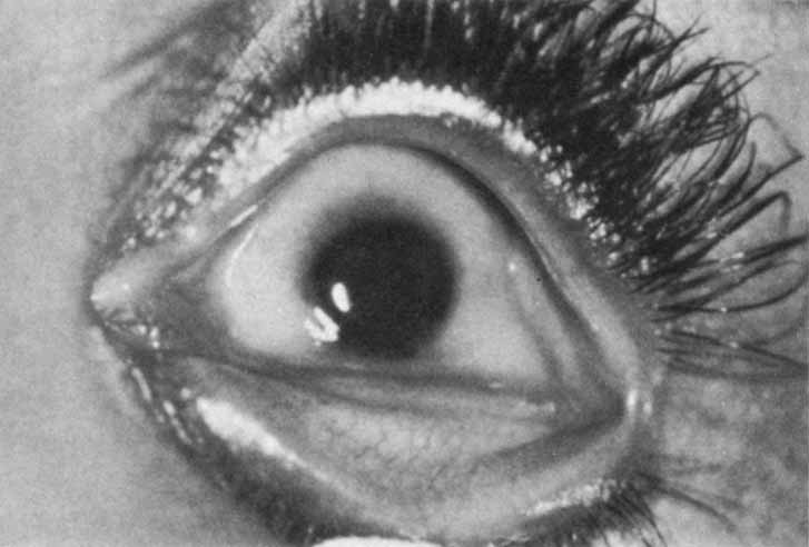 Sclerocornea is a condition in which normal cornea is replaced by white, vascularized tissue resembling the sclera, obliterating the limbus and scleral sulcus, and leaving a clearer central cornea (Fig. 6). This nonprogressive congenital anomaly is thought to result from defective mesenchymal migration at an early stage of differentiation.50 Given the broad use of the term sclerocornea in a wide variety of corneal disease, it is not considered a distinct diagnostic entity.51