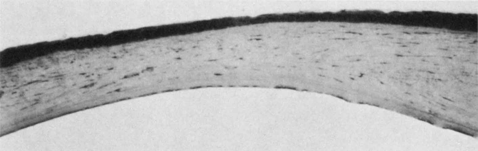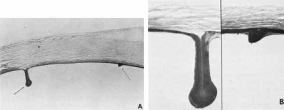 the tear. Acute ocular birth trauma is being seen less often by ophthalmologists because of improved prenatal care and elective cesarian section reducing the rate of complicated forceps deliveries (Fig. 8A). Ocular trauma from forceps is thought to occur when the forceps blade slides over the inferior orbital rim, compressing the globe against the superior orbit and stretching the cornea horizontally.65 Because the cornea is being compressed horizontally, these tears will line up in a vertical or oblique pattern (Fig. 8B). Other clinical findings associated with ocular birth trauma include ipsilateral periorbital edema and ecchymosis. Corneal edema is the most common presenting sign of infantile glaucoma when it presents in the first 5 days of life, being present in 80% of cases.66 By 6 months of age, approximately 75% of affected infants will manifest the corneal enlargement and buphthalmos characteristic of infantile glaucoma.66 The tears in Descemet's membrane caused by infantile glaucoma have a more random distribution, often circumferential to the limbus and sometimes extending sinuously toward the center of the cornea. Clinical features such as a delay in presentation of corneal edema, patterns of Descemet's tears, and associated ocular findings help to clearly distinguish ocular birth trauma from infantile glaucoma. When Descemet's membrane tears, it retracts more in the center leaving a dehiscence with roughly parallel edges.67 The stroma and epithelium overlying this tear will become diffusely edematous. Along the margin of the tear, Descemet's membrane will often curl toward the stroma like a watch spring. Clinically, this curl forms a refractile edge evident under retroillumination through the corneal edema. It is important not to mistake these prominent edges for the tear itself, which is actually the space between these edges. To perform a complete anterior segment evaluation, it may be necessary to remove the edematous epithelium with a moist cotton swab. The corneal edema should resolve within weeks to months, provided the birth trauma was not too severe and that the intraocular pressure was surgically lowered in cases of infantile glaucoma. With time, a fresh endothelium will resurface the posterior cornea and synthesize a new basement membrane, filling the dehiscence and accentuating the edges of the tear. After the corneal edema resolves, the edges of the break will appear as rounded, glassy ridges protruding from the posterior cornea readily apparent under retroillumination. In some instances, one edge of the tear may separate from the stroma and hang into the anterior chamber as a falciform ledge, with its free edge curling anterior to form a scroll (Fig. 9). When two tears occur parallel to each other, the edge of Descemet's membrane between the tears may curl toward each other. This strip of Descemet's may then disassociate from the overlying stroma, resulting in a glassy strand across the concavity of the posterior cornea. In this circumstance, the newly laid basement membrane will have a beaten-metal, guttate appearance. Histopathologically, the edge of a Descemet tear curls toward the stroma, possibly because of the differential elasticity between the anterior banded and posterior nonbanded layers within Descemet's membrane.67 As the new regenerating endothelium spreads over the edge, it encases the original coiled Descemet's membrane in a thick multilaminar periodic acid-Schiff (PAS)-positive basement membrane (Fig. 9). This new basement membrane forms the clinically evident refractile edge. Within the bed of the tear, the regenerating endothelium lays down an irregular basement membrane with focal excrescences that produce the beaten-metal appearance. Ultrastructural studies of the cornea in human congenital glaucoma are rare,68 but the ultrastructure in rabbits with spontaneous buphthalmos has been described in detail.69 Intraepithelial and subepithelial edema is present, accounting for the ease with which one can remove the epithelium clinically. Stromal edema, loss of regular collagen architecture, and the degree of scarring correlate with the degree of corneal opacity and thickness. In rabbits with mild to moderate corneal clouding, Descemet's membrane is thicker than normal and manifests the compact structure typical of basement membrane. In rabbits with more severe corneal opacification, a layer of small-diameter collagen fibrils enmeshed in amorphous material appears posterior to Descemet's membrane. In these rabbits, no tears in Descemet's membrane are observed clinically or histopathologically, suggesting that corneal edema may occur from elevated intraocular pressure alone. The thin endothelial cells can be as large as four times their normal size and contain cytoplasmic vacuoles appearing as small pits on scanning electron microscopy. In humans, these enlarged endothelial cells may represent the ones that decompensate later to produce corneal edema. Recently, in vivo confocal microscopy has been used to further evaluate Descemet's tears and endothelial changes associated with congenital glaucoma.70 Key findings include a mild reduction of keratocyte density in the middle and posterior stroma, along with the presence of discontinuous hyperreflective structures overhanging the endothelial layer at the level of Descemet's membrane. Additional confocal analysis of the endothelial layer demonstrate a low cell count, focal cellular lesions, severe polymegethism, and pleomorphism.70 Treatment is generally not necessary for patients with ocular forceps injury. The corneal edema will usually resolve within weeks. Corneal astigmatism may result from this injury and will require early refraction and patching to prevent amblypoia.65 In some instances, the edema may persist and form an opacification, which may require penetrating keratoplasty. In this circumstance, the visual prognosis is poor in the affected eye. Young children with infantile glaucoma may requir