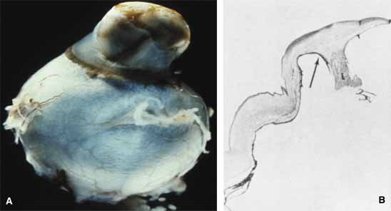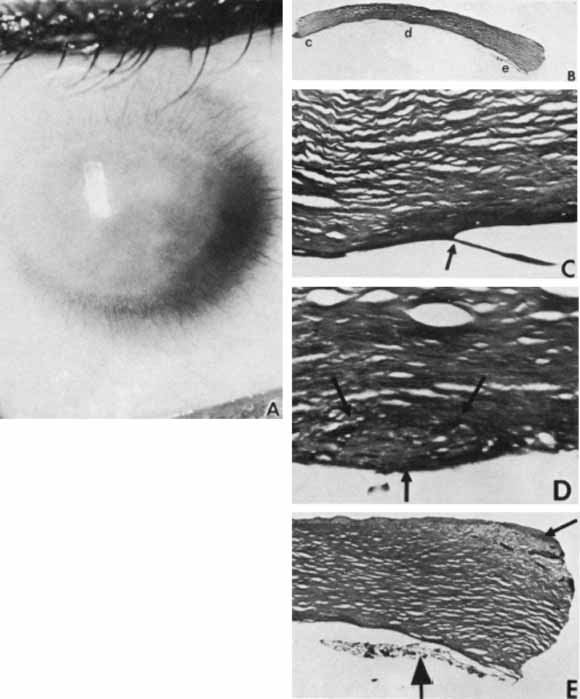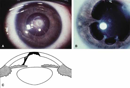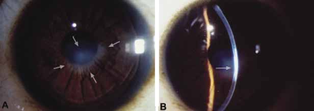 These anomalies are most commonly sporadic; however, autosomal-recessive inheritance has been reported.61 The opacity is bilateral in approximately 80% of cases61 and glaucoma is present in approximately half the cases, usually presenting within the first 6 years as the nonbuphthalmic infantile form. Occasionally, avascular opacities may diminish in density during the first few months, but usually not enough to permit normal visual development. POSTERIOR KERATOCONUS Posterior keratoconus usually presents as a focal and sharply circumscribed, noninflammatory central depression in the posterior cornea (Fig. 16); with rare generalized cases affecting the entire posterior cornea.109 In all cases, a stromal opacity ranging from a subtle haze to a focal leukoma overlies the focal posterior thinning. The edge of this posterior indentation either blends gradually with the rest of the cornea or may be sharply demarcated with a clinically evident prominent ridge.111 This condition shares no relationship to the common ectatic degenerative form of acquired anterior keratoconus and, although posterior keratoconus is usually considered to be congential, acquired cases have beendescribed secondary to trauma or after intracorneal hemorrhage.111,112 Posterior keratoconus is usually unilateral, sporadic, and nonprogressive, rarely becoming apparent during infancy. It is most often detected during routine ophthalmic examination because of an abnormal retinoscopic reflex or mild amblyopia. Amblyopia may result from the corneal opacity disrupting the visual axis or from irregular corneal astigmatism, which can be detected by corneal topography or keratometry. This condition can therefore affect the contours of both the anterior and posterior corneal surfaces. As part of a syndrome, posterior keratoconus has been described in association with systemic abnormalities, including mental retardation, stunted growth, and a webbed neck.113 Posterior keratoconus was also identified in a related syndrome associated with median facial clefting, severe genitourinary abnormalities, along with stunted growth, a broad nose, and an abnormal gait without any evidence of a chromosomal abnormality.110 Histopathology of posterior keratoconus demonstrates normal epithelial architecture with iron deposition in the basal epithelium corresponding to the iron line seen clinically.114 Bowman's layer is focally disrupted and replaced by fibrocellular tissue. There is stromal thinning with irregular stromal collagen lamellae and no evidence of inflammation or vascularization (Fig. 17). Descemet's membrane has a multilaminar configuration with replacement of the normal 3-μm-thick, 100-nm anterior banded layer by a more homogenous layer with focal wide-spacing collagen and small collagen fibrils. Posterior layers appear more like Descemet's membrane, with a 110-nm banded zone and a more compact homogenous zone. Paracentral focal excrescences of basement membrane-like substance may overly areas of vacuolated endothelium and correspond to the guttate excrescences seen clinically.110,114 Usually posterior keratoconus requires no treatment because it is often unilateral and asymptomatic. Correction of refractive error and any induced astigmatism can help improve vision, especially if amblyopia is present. Early use of a hard contact lens may produce a significant increase in vision. Penetrating keratoplasty may be necessary if either the opacity or the corneal irregularity is severe enough.110 INTERMEDIATE FORMS Intermediate forms of posterior corneal defects fit nicely into the anatomic stepladder classification and are often lumped under the term Peters anomaly. In one instance of focal posterior keratoconus, a ring of pigment clumps may be present on the endothelial surface.108 Another case of posterior keratoconus presented with iris strands extending from the collarette to the margin of the indentation.115 In another form, dense corneal leukomas can overlie a posterior corneal defect, with a normal iris and lens, and no keratoiridial adhesions (Fig. 18).108 PETERS ANOMALY The three anatomic components that constitute Peters anomaly are: (1) a posterior corneal defect with an overlying corneal opacity; (2) keratoiridial adhesions to the edge of the defect; and (3) corneolenticular contact or cataract. The size and density of the corneal opacity and the depth of the posterior defect can vary greatly and, in general, the central cornea appears more opaque than the periphery (Fig. 19). The corneal opacity can assume many forms, including a focal paracentral white spot, a discrete round central disc, a paracentral white arc paralleling the limbus, a tongue-shaped peninsula extending from the limbus to the central cornea, a central avascular leukoma with finger-like projections to the limbus, a central elevated mass that stimulates a corneal dermoid, or a diffusely vascularized cornea resembling sclerocornea. Keratoiridial adhesions usually extend from the collarette to the margin of the opacity (Fig. 19A–B). These iris strands may resemble fine filaments, broader bands, focal ropy cords, or broad fenestrated sheets. Visualization of the posterior corneal defect along with the iris and lens depends on the density of the opacity. In cases in which the opacity is too dense and posterior visualization is not possible, ultrasound biomicroscopy should be used to assess for other ocular abnormalities and permit an accurate diagnosis.4 Most cases are bilateral and more than half are accompanied by glaucoma.107 The histopathology of Peters anomaly is just as variable as its clinical picture (Fig. 20).108,115–118 The epithelium usually has a normal architecture with an intact basement membrane. Bowman's layer may be absent focally and replaced with fibrocellular tissue. Stromal scarring is usually present with some preservation of the normal lamellar pattern. The posterior stromal defect varies from a shallow depression to a deep crater. The endo