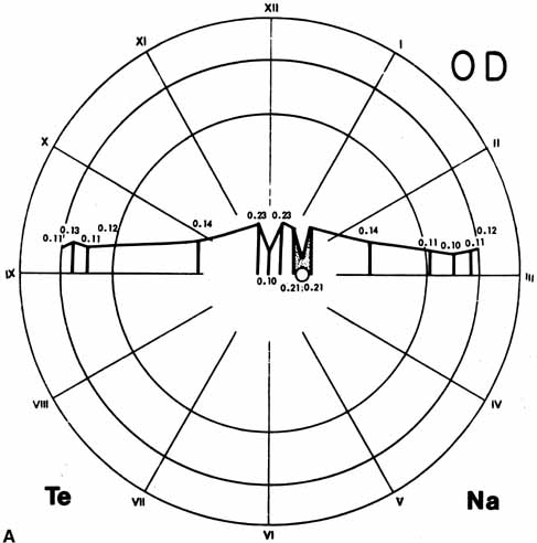 Gross retinal topography reveals characteristic regional variations. The clinical posterior pole is the central posterior retina approximately 5 to 6 mm in diameter, lying between the two temporal retinal arteries (Fig. 2). It is referred to anatomically as the area centralis or macula. Histologically, it is the only region of the retina with more than one layer of ganglion cells. The clinical macula, or the anatomic fovea, is the central area approximately 1.5 mm in diameter within the area centralis. The name macula lutea was given to this region because of the slightly yellow coloration of this area resulting from the presence of xanthophyll in the ganglion and bipolar cells.2 Within the center of the anatomic fovea lies a depression approximately 0.35 mm in diameter surrounded by a ring of slightly thickened tissue. This region is called the foveola by anatomists and the fovea by clinicians. It lies within the capillary-free zone, which measures approximately 0.4 mm in diameter in most people. The photoreceptors in this region characteristically consist of pure cones. The center of the pit within the foveola is called the umbo. It is located 3.4 ± 0.34 mm from the temporal edge of the disc margin and 0.8 mm inferior to the center of the optic disc.3 The anatomic fovea is surrounded by a 0.5-mm-wide ring zone called the parafovea. This area is where the ganglion cell, intranuclear layer, and outer plexiform layer are the thickest. A 1.5-mm ring zone surrounding the parafovea is called the perifoveal area.