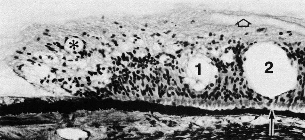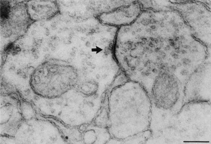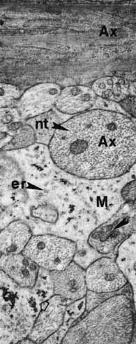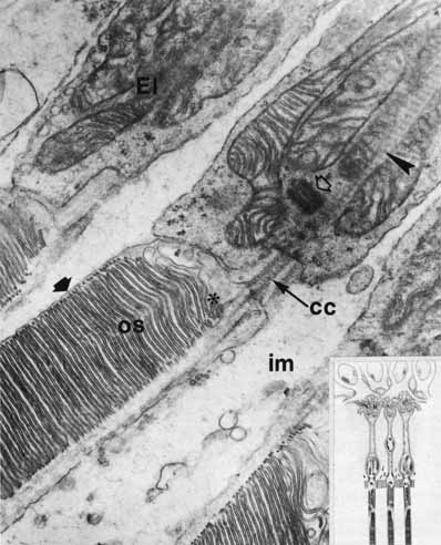 The basic feature of the presynaptic elements of the chemical synapse is the boutons terminaux at the ends of the axons, or boutons en passant along their length.45 In the central nervous system, these occur at points where myelination has ceased. The lack of myelination in the retina makes it impossible to use myelination gaps for synapse identification. Although most synapses are axodendritic, axosomatic, or axoaxonal, other types have been documented in the brain and the retina where the presynaptic component is not axonal but dendritic or somatic. However, all of these synaptic types share a common morphology consisting of presynaptic and postsynaptic membranes, the densities associated with their cytoplasmic faces, and the synaptic cleft between them. In the retina, three different classes of chemical synapses have been described based on the appearance of the presynaptic element: conventional synapse, ribbon synapse, and flat or basal junction.66 The conventional synapse, which is similar in morphology to other chemical synapses found throughout the vertebrate nervous system, has aggregates of synaptic vesicles clustered close to the presynaptic membrane. These vesicles are membrane-bound organelles that contain neurotransmitter substances and enzymes involved in neurotransmitter metabolism.67 They lie in the midst of a hexagonal array of electron-dense particles, each 30- to 50-nm wide and separated from neighboring particles by an interval of 20 to 50 nm.68 This electron-dense material is believed to play a role in the attachment of the synaptic vesicles to the presynaptic membrane. These synapses are found in the presynaptic terminals of horizontal cells, amacrine cells, and interplexiform cells.66 They typically have an inhibitory effect in the postsynaptic neuron. The ribbon or invaginating synapse, in contrast, is usually found in the presynaptic terminals of photoreceptors and bipolar cells in the retina (Fig. 20). They are also often observed throughout the invertebrate nervous system. The presynaptic terminal of the ribbon synapse is characterized by the presence of an electron-dense bar or a ribbon of approximately 1 um length that is oriented perpendicular to the presynaptic membrane. Reconstruction reveals that this ribbon is in fact a rectangular or horseshoe shaped plate composed of two osmiophilic electron-dense lamellae flanking an electron-dense central layer69,70 This synaptic ribbon is surrounded by a precisely arranged array of synaptic vesicles and appears to be anchored to the presynaptic membrane by three to five delicate electron-dense filaments. The shape and size of the synaptic ribbons can change depending on the maturation stage, activity state of the synapse, or light/dark cycle. Although the precise function of the synaptic ribbon is unknown, it has been hypothesized to function as a “conveyor belt” to channel synaptic vesicles to the presynaptic membrane for neurotransmitter release, to immobilize the vesicles in inactive synapses, storage device for synaptic transmitter, and to act as a diffusion barrier for presynaptic ions.69 In the inner plexiform layer, this synapse has two postsynaptic processes, forming a “dyad.” In the outer plexiform layer, there are three postsynaptic processes, forming a “triad” (see Fig. 20). Basal junctions are found in the presynaptic terminal of photoreceptors only.66 In the mammalian retina, these junctions are found only in association with cone cells. Typically, the presynaptic membrane is smoothly indented, and there is prominent electron-dense material on the inner surface of the terminal membrane. However, no synaptic vesicle is seen in association with the electron-dense material. The exact mechanism for chemical transmission through these synapses is unclear. However, in axonal terminals of goldfish horizontal cells in which no presynaptic vesicles are found, neurotransmitter release is believed to occur by a carrier-mediated mechanism.71 Such a process may be involved in basal junctions of mammalian photoreceptors. The involvement of a neurotransmitter in signal transduction is implicated by freeze-fracture studies that show that the postsynaptic membranes of these synapses contain particles that are similar to those found in the postsynaptic membranes of these synapses contain particles that are similar to those found in the postsynaptic membranes of a conventional synapse in the brain. The synaptic cleft of a typical chemical synapse is 20- to 30-nm wide.45 It is not a free space because it houses material that binds the presynaptic and postsynaptic membranes together in a strong adhesion. The electron-dense plaque in the middle of the synaptic space contains mucopolysaccharides and proteins, which may serve to maintain the attachment between the presynaptic and postsynaptic membranes through a form of polyionic binding. Filaments composed of macromolecules span the synaptic cleft. This synaptic cleft substance may be important for formation, localization, and proper function of the synapse. Macromolecules spanning the gap between the presynaptic and postsynaptic membranes may ensure rapid transport of the transmitter molecule through the cleft and may prevent the transmitter from diffusing away from the synapse.72 In the postsynaptic membrane, a linear density is present. From this structure, filaments project out toward the cytoplasm.45 These densities form either a single large or several small discs, which may be interspersed with puncta adhaerentia. The anatomic location of the receptors for the transmitter molecule in the postsynaptic membrane has not yet been determined. However, freeze-fracture studies have shown minute bumps within the specialized zone of the postsynaptic membrane that may represent the neurotransmitter receptor molecule.66 In the case of the neuromuscular junction, alpha-bungarotoxins that bind to the acetylcholine receptor have been localized in the regions of the posts