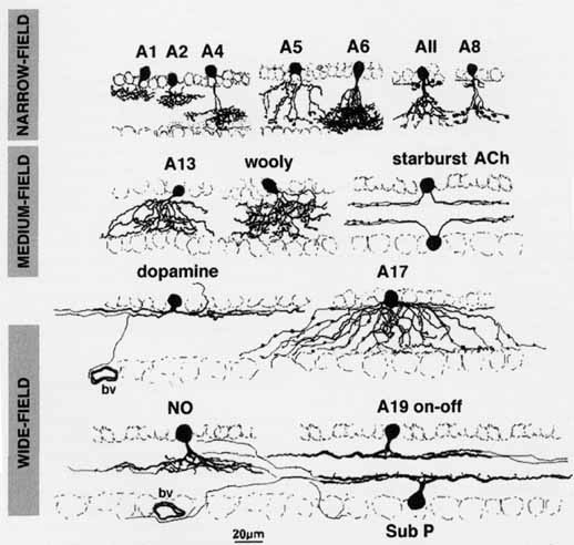 The stratified amacrine cells are classified on the basis of the layers wherein their processes lie. Most of these fibers run in the outer half of the inner plexiform layer. Processes of the unistratified amacrine cells extend horizontally in an area as wide as 500 μm, whereas multistratified amacrine cells have their main processes run from the cell body through the center of the inner plexiform layer and spread 400 to 600 μm horizontally at two or more levels. The third type of stratified diffuse amacrine cell has been called polystratified because it has arborization that is less than 50 μm in diameter. These cells have a smaller nucleus than the other stratified amacrines. In recent years, a new class of amacrine cells has been described. These cells are referred to as displaced amacrine cells because their cell body is located in the ganglion cell layer, although they have the morphologic characteristics of amacrine cells. In the cat retina, the displaced amacrine cells constitute the majority of the amacrine cells in the peripheral retina.135,136 The extremely broad extent of spread of amacrine cell processes indicates that these cells play an important role in the modulation of electrical information reaching the ganglion cells. In the past several years, more than 30 different types of neurotransmitters have been found in the synaptic terminals of the amacrine cells. These include acetylcholine, GABA, glycine, dopamine, and various neuropeptide-like substances (see Table 1). They include excitatory and inhibitory neurotransmitters. Medium-field inhibitory GABA amacrine cells, in particular starburst amacrine cells, are involved in the formation of directional selectivity and optokinetic eye movement.137 Other amacrine cells may be concerned with spatially constricting the ganglion cells receptive field centers by either constructing a strong inhibitory surround or by contributing the ganglion cell centers.120 Recent immunocytochemical studies in the human retina localized one of the transmitters, glycine, to most of the narrow field amacrine cells. One of these cells, AII amacrine cell of the rod pathway, function to increase phasicity and speed up the ganglion cell message to the brain.62 Studies in the turtle retina suggest that glycinergic synapses also are involved in interamacrine signals (Fig. 30).138 Interplexiform Cells The interplexiform cells were first described in the vertebrate retina by Gallego in 1971.139 The name denotes their dendritic branching in both the outer and inner plexiform layers. These cells have their cell body in the innermost zone of the inner nuclear layer and have both presynaptic and postsynaptic connections in the inner plexiform layer.11 In the outer plexiform layer, these cells extend long horizontal branches and also make presynaptic connections with bipolar and horizontal cells. Thus, the interplexiform cells are unique among retinal neurons in their ability to feed back information from the inner retina to the outer synaptic layer. On the basis of the neurotransmitters present in the synaptic terminals, three different types of interplexiform cells have been identified in the vertebrate retina.60 The cells positive for GABA have processes that project to the outer plexiform layer and synapse with bipolar cells. The cells that contain tyrosine hydroxylase and dopamine have presynaptic and postsynaptic processes that terminate in the inner plexiform layer and make connections with amacrine cells. These cells also have presynaptic connections to bipolar and horizontal cells in the outer plexiform layer. The third cell type, containing glycine, has presynaptic and postsynaptic terminals in the outer plexiform layer that form junctions with horizontal cells. Recent Golgi preparations and immunocytochemical studies of the human retina showed only one class of interplexiform cells thus far.62,113 This cell type appears to use GABA as its transmitter. Inner Plexiform Layer Interposed between the inner nuclear and ganglion cell layers are the synaptic processes of the bipolar, ganglion, and amacrine cells, as well as Müller cell branches and retinal blood vessels. The inner plexiform layer is the culmination of neural processing underlying the visual channels that converge to form the ganglion cell response. Cajal (1882) divided this layer into five strata based on his morphological studies on different branching levels of bipolar, amacrine and ganglion cell processes (Fig. 31). The five strata can be further subdivided into the neuropil that drives OFF-center ganglion cell responses (sublamina a, S1 and S2) and the neuropil that drives ON-center ganglion cell responses (sublamina b, S3, S4 and S5). The bipolar cells form the typical neurosynapses, with synaptic vesicles, mitochondria, and synaptic ribbons. These synapses, termed dyads, occur throughout the inner plexiform layer.96 In this type of synapse, the bipolar cell contracts two processes, one from a ganglion cell and the other from an amacrine cell (Fig. 32). The number of neurochemical synapses in the inner plexiform layer is vast. There are approximately 2.9 million dyads per square millimeter of retina.50 These connections are so elaborate that a single amacrine cell may be both presynaptic and postsynaptic to different segments of the same bipolar cell. Of note, there are two unusual synaptic arrangements in the inner plexiform layer involving amacrine cells.11 First, at many dyads of bipolar cell terminals, the connecting amacrine cell may make a synapse nearby back onto the bipolar cell terminal, suggesting a local feedback mechanism between these cells. Such synapses have been called reciprocal synapses. The second type of synaptic arrangement, termed serial synapses, consists of an amacrine cell process synapsing with an adjacent amacrine cell process, which may synapse in turn with a process from a third cell, which may be a ganglion cell dendrite, a bipolar cell terminal, or a
