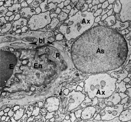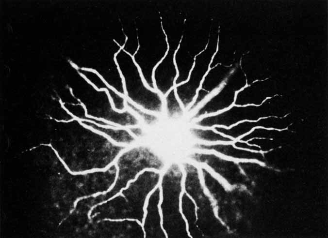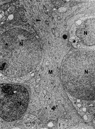 The Müller cell forms tight junctions with other Müller cells and with neural cells.196 On the outer side of the retina, a continuous row of zonulae adherentes formed by the Müller cells is the external limiting membrane.195 This row of junctions provides a barrier to the passage of metabolites in and out of the retina. The Müller cell cytoplasm shows evidence of topographic specialization.194 The cytoplasm toward the inner half of the cells is denser than that of the outer half and contains the machinery for protein synthesis, patches of radially oriented filaments, and small dense particles (Fig. 39). Radioactive tracer studies demonstrated that glycogen and protein synthesis is highest in this region.197 The outer half of the cytoplasm contains a high concentration of mitochondria, microtubules, and glycogen. This part of the cell is believed to participate in absorption and intracellular transport. Numerous microvilli are seen in the outer half extending beyond the external limiting membrane; they may be involved in an exchange of metabolites with the pigment epithelium and in maintaining a homeostatic environment in the region of the photoreceptor outer segment. Potassium released into the extracellular space with neuronal activity is removed from the outer retina, probably by an active pump in the microvilli of Müller cells.195 Nuclei of Müller cells have eccentric nucleoli and are positioned in the inner nuclear layer of the retina.198 The soma of these cells, however, can be distinguished from that of the other cells within the same layer by the microscopic appearance of a dense cytoplasm resulting from the large content of ribosomes and endoplasmic reticulum. In fact, the metabolic synthetic machinery in Müller cells is more highly developed than in any other cell in the eye, except that in the pigment epithelial cell. Recent studies in cultured Müller cells show that these cells can synthesize retinoic acid and may be a source of retinoic acid in the retina.199,200 In addition, the Müller cell has also been found to be the only human retinal cell that contains cellular retinol- and retinaldehyde-binding proteins.201,202 This implies that the Müller cell may play an important role in local metabolism and processing of the visual pigment. Thus, disease processes seen clinically that affect Müller cells would result in both metabolic and structural changes in the entire retina. Müller cell dysfunction may be the basis for progressive retinal disintegration of all the retinal layers in clinical entities such as senile and X-linked juvenile retinoschisis.193,203 Recently, Gass described a cone-shaped zone of Muller cells that composes the central and inner part of the fovea centralis. These cells were hypothesized to act as a repository for xanthophylls and may play a role in the pathogenesis of macular disease, e.g. macular hole and foveomacular schisis.204 ASTROCYTES Although the Müller cells constitute the majority of retinal glial cells, the astrocytes (astroglia) are widely dispersed between the vasculature and the neurons (Fig. 40). On the basis of the morphologic and cytoplasmic features of these cells, they can be classified into fibrous astrocytes, protoplasmic astrocytes, and lemmocytes,194,205,206 The fibrous astrocyte is a branched cell that adheres to the walls of the larger retinal arteries. Viewed by electron microscopy, these cells have a homogeneous cytoplasm with a dense round-to-oval nucleus that may be flattened on the surface next to a large blood vessel. The thin layer of cytoplasm has a smooth and granular endoplasmic reticulum, vesicles, and a few mitochondria.193 The Golgi apparatus is located in one of the cellular processes that clasp the wall of the blood vessels and reach into the nerve fiber layer where they embrace a large number of axons. These processes and cell bodies have their cytoplasm filled with fine fibrils approximately 10 nm in diameter. The nuclei of astrocytes, unlike those of Müller cells, are located in the nerve fiber layer. The protoplasmic astrocyte is distinguished from the fibrous astrocyte by its fewer and thicker branches. These cells have coarse nuclear chromatin granules and irregularly shaped nuclei surrounded by a clear cytoplasm containing only a few fibrils.194,205 These astrocytes have their nuclei some distance away from the adventitia of vessels to which they are attached. Both protoplasmic and fibrous astrocytes produce a basement membrane that juxtaposes their plasma membrane with the adventitia of the vessels they surround. The third type of astrocyte is a long, thin, bipolar glial cell that resembles bipolar astrocytes of the central nervous system.207,208 In the retina, this cell has long, slim processes that traverse the retina within nerve fiber bundles, but it has not been observed to make contact with blood vessels.195 Astrocytes are characterized by prominent cytoplasmic fibrils and the formation of pedicles at the surfaces of blood vessels on electron microscopy studies.183 They have a sparse endoplasmic reticulum and are electron-dense. They contain a noticeable concentration of glycogen granules, elongated mitochondria, microtubules, a cilium, and an occasional centriole. Their processes appear to have punctate adhesions or “gap” junctions between them. The major distinguishing feature between the two major types of astrocytes is their difference in shape and amount of cytoplasmic fibrils. The protoplasmic astrocytes are more rounded and have fewer cytoplasmic fibrils than the fibrous astrocytes. Within the ganglion cell layer, the astrocytes tend to lie horizontally. Their slender processes form an interconnected honeycomb-like scaffolding between vessels and neural cells that is parallel to the internal limiting membrane and perpendicular to the Müller fibers. The astrocytic cell bodies are located in the inner plexiform layer and send processes that reach as far as the inner nuclear laye