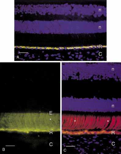 tissue after injury.180 Glial cells of the retina can be divided into two categories, macroglia and microglia.181 Macroglia originate from the neural crest and consist of Muller cells (radial gliocytes) and astrocytes.182 The microglial cells, similar to vascular endothelial cells and pericytes, originate from the mesoderm.45 The predominant macroglial cell of the retina is the Muller cell. These cells span the entire thickness of the retina and are oriented radially in the retina. In animals with avascular retina, Muller cell is the only macroglia present and carries out all the functions typical of macroglia. Animals with a vascularized retina, e.g., mammals, also have astrocytes. Astrocytes migrate into the retina via the optic nerve during embryogenesis and become located exclusively in the inner layers of the retina. Astrocytes are stellate in shape and their cell bodies are located in the ganglion cell layer. Their processes show no strict orientation.180 Macroglial cells, astrocytes, are characterized by prominent cytoplasmic fibrils and the formation of pedicles at the surfaces of blood vessels on electron microscopy studies.183 They have a sparse endoplasmic reticulum and are electron-dense. They contain a noticeable concentration of glycogen granules, elongated mitochondria, microtubules, a cilium, and an occasional centriole. Their processes appear to have punctate adhesions or “gap” junctions between them. The major distinguishing feature between the two types of macroglial cells is their difference in shape and amount of cytoplasmic fibrils. The protoplasmic astrocytes are more rounded and have fewer cytoplasmic fibrils than the fibrous astrocytes. Another macroglial cell present in the central nervous system is the oligodendrocyte, which is not normally found in the retina. However, these cells bear sufficient resemblance to Müller cells to warrant comparison. The oligodendrocytes, like the Müller cells, tend to arrange themselves in geometric rows. Their presumed functions are to form myelin and provide nutrition and structural support for neurons. The former does not take place in the normal retina, although myelination of nerve fibers can occur secondary to developmental anomaly, suggesting a potential myelin-forming capacity of retinal Müller cells. Microglial cells differ from macroglial cells in their smaller size and embryonic origin. They originate from mesodermal invagination of nervous tissue at the time of embryonic vascularization and are thought to arise from pericytes of blood vessels.189 Although the presence of these cells in normal undamaged neural tissue has been debated for years, they are now thought to be a definite part of normal neural tissue, including the retina. These cells become prominent in response to tissue injury by multiplying and assuming a histiocytic configuration.190 They act as scavengers, ingesting debris by phagocytosis and transporting it to the blood vessels for disposal. The migrating phagocytic cells (i.e., monocytes) complement microglial cells in their scavenger role in the retina.185 When there is significant blood vessel damage in injured neural tissue, migrating blood-borne phagocytes are recruited and provide the bulk of the phagocytic activity.191 Thus, reactive microglia include cells derived from microglia, blood-borne monocytes, and pericytes.192 Which cell type is prominent depends on the extent of blood vessel injury. Retinal degeneration, such as retinitis pigmentosa, which avoids disruption of blood vessels, would result in microglial phagocytosis, whereas ischemic retinal damage, such as that following diabetic retinopathy, would result in monocytic invasion. MÜLLER CELLS The Müller cells are the principal glial cells that maintain the structure of the retina. They are the largest cells in the retina and the only cell type that occupies the full thickness of the retina from the external to the internal limiting membrane (Fig. 38). Their cytoplasmic extensions reach between and envelop neuronal cells bodies and processes, filling all intercellular spaces except for synapses between the neural cells, spaces in the adventitia of large blood vessels, and the small (less than 20 nm) potential spaces between ganglion cell axons and dendrites.193 This vast extension of Müller cell processes effectively enmeshes the remainder of the retina such that all cell bodies and cellular processes between the external and internal limiting membranes reside in tunnels within Müller cells. The mature Müller cell envelops the surrounding retinal cells by an elaborate distribution of four types of cell processes
