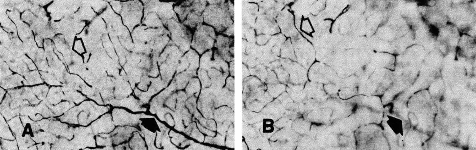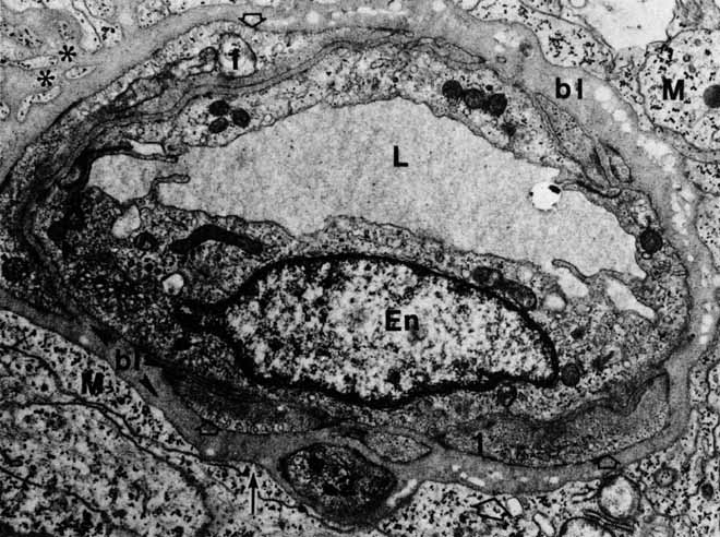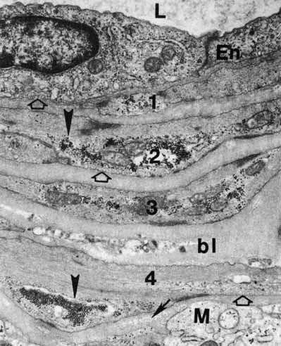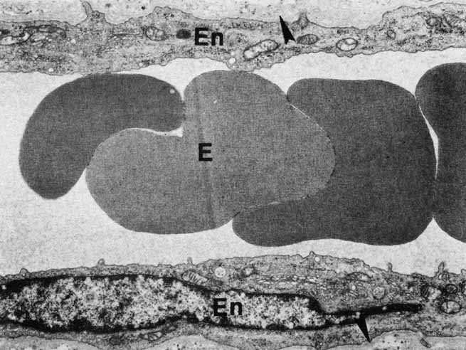 The termination of the capillary beds at the border of each of these avascular areas follows a common pattern. At the edge of the capillary-free zone at the fovea, long capillaries link the terminal arterioles and venules to form a delicate circular web of concentrically arranged channels whose width decreases as they approach the edge of this arcade. There are no direct shunts between the arterioles and venules in this or any other terminal area of the retinal circulation. The only normal connection between the inflow and outflow systems is through the capillaries. At the retinal periphery, the capillary bed terminates in an arcade between the arterial and venous system. The major distinction of this region is that the capillaries are more widely separated from each other and are of wider caliber than at the perifoveal arcade. But here, too, there are no shunts between arterioles and venules in the normal eye, and there is a capillary arcade facing the avascular space that surrounds both the arteries and veins. Recent advent of scanning laser Doppler flowmetry has made it possible for retinal blood flow to be quantitated clinically. Volume of blood flow in the nasal retina was significantly lower than that for the temporal retina as a result of smaller retinal vessels and slower blood flow velocity in the nasal retina.249 This was consistent with the higher metabolic demand expected of the temporal retina from its larger size and the presence of the metabolically active fovea. The blood flow through the fovea itself was low because of the presence of the foveal avascular zone.250 The capillary meshwork spreads from the ganglion cell layer through the inner nuclear layer. There are no vessels in the outer plexiform and outer nuclear layers (see Figs. 3 and 47). The exact pattern of distribution of the capillaries in the retina was controversial because of conflicting earlier reported results. With trypsin digest studies, a diffuse arrangement was suggested (see Fig. 48).251,252 In contrast, whole-mount preparations demonstrated that the capillary bed is divided into two distinct laminae throughout most of the posterior retina (Fig. 49).253,254 According to this bilevel schema, the deep capillaries lie in the inner nuclear layer and form a more closely set meshwork than do the superficial capillaries that occupy the nerve fiber and ganglion cell layers. The outer meshwork appears to consist of fine-caliber vessels ranging from 15 to 130 μm in diameter. The superficial capillaries have a slightly wider caliber, ranging from 16 to 150 μm in diameter. The volume of the deep capillary network is relatively constant at different locations of the posterior retina. In contrast, the volume of the superficial capillary network varies dramatically and parallels the thickness of the nerve fiber layer rather than the total retinal thickness.255,256 Thus, in the peripapillary retina the vascularity is the greatest, and up to four different capillary layers are identifiable, even though the retinal thickness is comparable to that of the parafoveal crest (Fig. 50). In contrast, in the perifoveal region and at the ora serrata, the capillary network thins to a single layer. In the peripapillary region, this unique lamina of capillaries in the superficial portion of the nerve fiber layer originates from intraretinal precapillary arterioles and drains into retinal venules and veins lying on the optic nerve head.257 These capillaries have a long straight or slightly curved path fanning out over the nerve fiber layer within two disc diameters of the papilla and are the most prominent in the superior and inferior temporal quadrants of the peripapillary zone. This peripapillary radial capillary bed is unique among retinal capillaries in its lack of anastomoses with other capillaries, infrequent arterial input, and unusually great length (over 100 μm). These features make these capillaries especially vulnerable to the effects of elevated intraocular pressure and changes in retinal perfusion. This anatomic distinction has been invoked to explain the arcuate scotoma in glaucoma, peripapillary flame-shaped hemorrhages associated with hypertension and papilledema, and superficial cotton wool spots associated with retinal ischemia.258,259 The capillary wall is the simplest of the walls of the retinal vessels. It consists of endothelial cells, intramural pericytes (Figs. 51 and 52), and basement membrane. The endothelial cells are so attenuated that their nuclei bulge into the lumen of the capillary. Because the diameter of the lumen of capillaries is small, ranging from 3.5 to 6 μm, the nuclear protrusion causes sufficient distortion that circulating erythrocytes must mold themselves to the luminal contour to pass. The endothelial cells form tight junctions with each other, preventing metabolites from passing freely through the vessel wall. The tight junctions are continuous and are the anatomic basis for the blood–retinal barrier.239 Pinocytic vesicles have been visualized with electron microscopy (see Figs. 51 and 52) and provide the only known significant means for metabolic transfer between the circulation and the retina. Diseases involving the endothelial cells disrupt this normal physiologic barrier and result in exudation of protein and lipid into the surrounding retinal tissue. This breakdown in the blood–retinal barrier is often transient because the endothelial cells can undergo mitosis in response to injury and can form new tight junctions.28 The intramural pericytes reside within the basement membrane of the capillary endothelium (see Fig. 51). They can be seen in cross sections examined by electron microscopy or in stained mounts of trypsin digest examined by light microscopy.260 The nuclei of the intramural pericytes are darker and more spherical than those of the endothelial cells. They bulge externally toward the surrounding glia. The cell contour, shown by special staining or by retinal diges