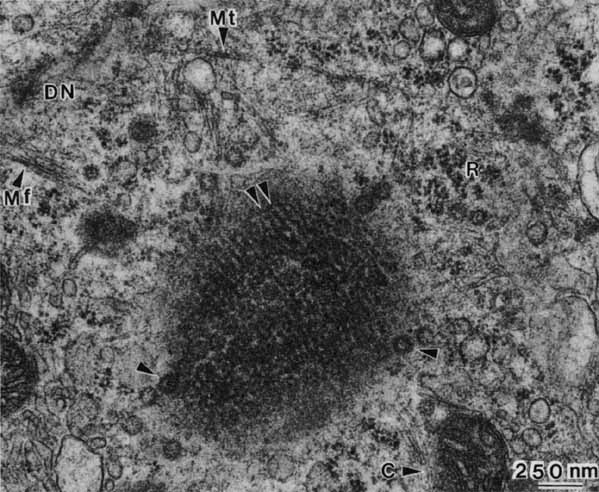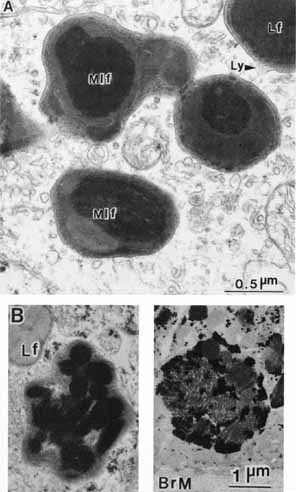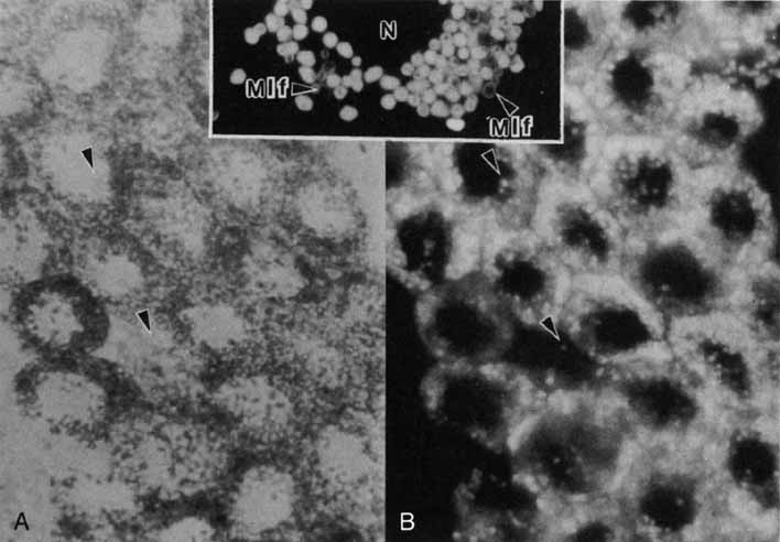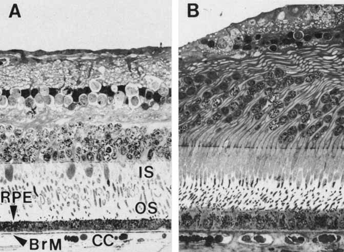 Age-related macular degeneration (AMD) is the leading cause of blindness among adults. Although the specific causes of AMD remain unknown, these include a combination of intrinsic (i.e., genetic predisposition) and extrinsic (i.e., environmental insult such as toxic and/or photooxidative damage) factors that have their primary impact on the RPE.71 AMD is associated in its early phases with the buildup of incompletely metabolized waste products in association with the RPE, both intracellularly (i.e., lipofuchsin) (Fig. 17) and extracellularly (i.e., drusen) (Figs. 18 and 19). Subsequent malfunction of the RPE proper, and/or Bruch's membrane, lead to the progression of AMD from its “dry” state with damage to the RPE and neural retina, wherein the focus of the lesion remains at the RPE/neural retina interface, to the “wet” state wherein signals that possibly originate with the RPE result in abnormal responses in surrounding tissues resulting in neovascularization in the choriocapillaris.72 Evidence to support the “toxic accumulation” hypothesis has come from studies of Stargardt's disease, a form of juvenile macular degeneration, whereby a primary defect of lipid metabolism in the neural retina leads to accumulation of toxic products following their uptake by the RPE, whose failure then subsequently leads to photoreceptor loss.73 Proliferative vitreoretinopathy (PVR) is another significant ocular disorder of unknown etiology wherein the RPE is implicated. PVR is the major complication resulting from retinal detachment that limits the success of surgery to re-attach the neural retina and RPE, and may occur in up to 10% of all rhegmatogenous retinal detachments.23 PVR is characterized by aberrant wound healing, after retinal tearing, as cells, including RPE cells and possible astrocytes and fibroblasts as well, proliferate at the vitreal-retinal interface (and sometimes in the subretinal space) leading to scarring and generation of tractional forces that may re-detach the retina. Among the risk factors associated with onset of PVR are the presence of retinal tears, a prolonged period of detachment, vitreal damage, and damage to the RPE with subsequent compromise of the blood–ocular barrier and displacement of RPE cells into the vitreous cavity.74 Although specific mechanisms remain to be elucidated, it is likely that PVR results in part from alterations of RPE phenotype in response to growth factors and extracellular matrix components of the vitreous and/or serum encountered as a result of the breakdown of normal tissue compartments of the eye.22,23 |