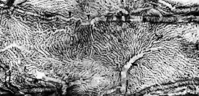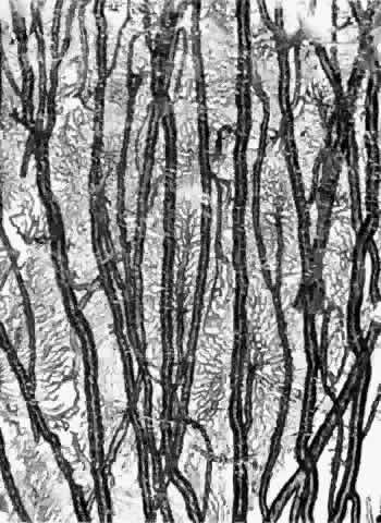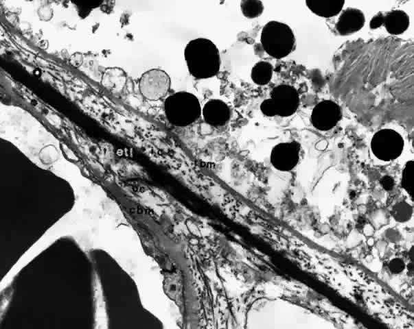Ultrastructurally, the basement membrane of the RPE and choriocapillaris is made of fine filaments that blend with the collagen of the adjacent collagenous zones. The basement membrane of the RPE is separated from the cytoplasmic membrane of the RPE, from which it is derived, by a 100 nm radiolucent zone. The cytoplasmic membrane of the RPE cell has many infoldings, which its basement membrane usually does not follow, although it may project slightly into the outer part of some folds.22,23 The basement membrane of the RPE is continuous with the basement membranes of the pigmented epithelium of the ciliary body and anterior pigmented epithelium of the iris and, therefore, extends from the optic disc to the pupillary edge of the iris. The basement membrane of the choriocapillaris is discontinuous at the intercapillary septa. The inner and outer collagenous zones are made up of randomly oriented collagen fibers measuring 60 nm in diameter. Many are parallel to the retina, and others pass from the inner collagenous zone through the elastic layer into the outer collagenous zone. At the ora serrata, the inner collagenous layer thickens, displacing the elastic layer outwardly. The elastic layer, the middle layer of Bruch's membrane, is a dense, irregularly interrupted band composed of interwoven elastic tissue fibers of various thickness. The elastic fibers are ultrastructurally composed of long and straight rods with a homogeneous core and dense cortex. Variably sized spaces are present between the elastic fibers. They provide passageways for collagen fibers from the inner collagenous zone to the outer collagenous zone and into the intercapillary septa and subcapillary zone of the choriocapillaris (Fig. 10). The elastic tissue and collagenous layers of Bruch's membrane become circularly oriented around the edge of the optic nerve.