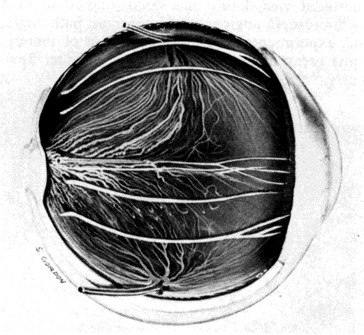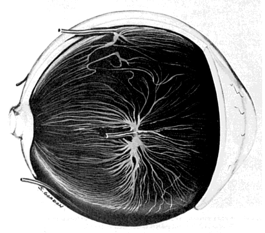 The deep brown color of the choroid results from the large number of melanocytes found around the noncapillary blood vessels in the deeper layers of the choroidal stroma and in the suprachoroidal lamellae. The number of melanocytes in the choroid increases from the inner to outer layers. The choroidal vasculature can be visualized in albino patients because of their lack of melanin pigment (Fig. 5). The vascular pattern may also be observed on gross examination of eyes (Fig. 6). Despite being the subject of intense investigation, the exact role of the choroid remains unclear and speculative. Controversies exist regarding the angioarchitecture of the choroidal vasculature and how the vascular arrangement relates to clinical lesions demonstrated by angiography. Many unanswered questions exist: What is the significance of the architectural organization of the choriocapillaris? Although our knowledge regarding the choroid is more detailed and catalogued than it was in the past, it appears that a complete understanding of the role of the choroid lies in the future. It is likely that new modalities of examining the choroidal circulation may accelerate this process. EMBRYOLOGY The choroid develops from two embryonic tissues: the mesoderm and cranial neural crest cells. In the 3-mm embryo, undifferentiated tissue derived from cranial neural crest cells surrounds the optic vesicle.1–5 Tubes or spaces lined with endothelium of mesodermal origin grow from the central axis to the caudal end of the optic vesicle. The tubes form a plexus, which constantly changes and expands as the primitive eye grows. At this stage, the tubes are neither veins nor arteries, and the direction of blood flow is not orderly. The choroid is thought to develop in three stages: