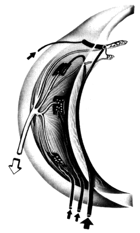There is marked interindividual variation in the areas supplied by the nasal and temporal posterior ciliary arteries in humans as determined by in vivo studies.46 The nasal posterior ciliary artery may supply the entire nasal choroid and extend laterally to the level of the fovea including the optic nerve head; its supply may stop prior to the nasal peripapillary choroid, giving no supply to the optic nerve head; or there may be any variation between these two extremes. The temporal posterior ciliary artery supplies the area of the choroid not supplied by the medial posterior ciliary artery and vice versa. When there are more than two posterior ciliary arteries (i.e., nasal, temporal and superior) the area supplied by each of them may be one quadrant or only a sector. Short Posterior Ciliary Arteries. Ten to 20 short posterior ciliary arteries, either directly from the ophthalmic artery or from their respective posterior ciliary arteries, perforate the sclera near the optic nerve. The vessels tend to cluster 2 to 2.5 mm from the dural sheath of the disc (Fig. 15) in the horizontal meridian between the optic nerve and the wreath of short ciliary nerves. Usually more vessels are found inferotemporal to the scleral entrance of the temporal long posterior ciliary artery and nerve16; however, some variability occurs. A smaller cluster of short ciliary arteries enters nasal to the optic nerve, and a few enter the sclera above and below the optic nerve. The short posterior ciliary vessels branch either in the orbit, the suprachoroid, or in the outer layers of the choroid into distal branches and smaller paraoptic branches. The distal branches radiate toward the equator in the outermost layers of the choroid (Fig. 16) and supply triangular areas of the choroid with the apices of the triangular areas located posteriorly, close to their point of entry.47 The short posterior ciliary arteries terminate principally in the choroid. The paraoptic branches of the short posterior ciliary arteries enter straight or curve posteriorly in the choroid to supply the vertical and peripapillary choroid either directly or via branches derived from the circle of Haller and Zinn. Additionally, the short posterior ciliary arteries serve the episcleral arterial plexus. Occasionally a branch of the short posterior ciliary artery enters the retina as a cilioretinal artery. The circle of Haller and Zinn is an intrascleral anastomosis between the temporal and nasal short posterior ciliary artery branches that often forms a ring around the optic nerve. Pial and recurrent choroidal branches originate from this anastomosis to supply the retrolaminar optic nerve and, in a trapezoid shape, the peripapillary and vertical meridional choroid.37 The episcleral vessels located on the posterior aspect of the globe and the area around the optic nerve form the posterior episcleral arterial plexus. This plexus is a variable finding of rich artery-to-artery anastomoses.30 Branches to the plexus are derived from arteries on the dural sheath of the optic nerve, the long and short posterior ciliary arteries before scleral penetration, arteries from the inferior and superior oblique and the deep head of the lateral rectus muscles, vessels accompanying the short ciliary nerves, and small vessels from the surrounding loose areolar tissue.48 The plexus also has arteriovenous connections with the vortex vein system.30 Long Posterior Ciliary Arteries. The nasal and temporal long posterior ciliary arteries arise variably—as direct branches from the ophthalmic artery, from their respective posterior ciliary arteries, or as branches of a short posterior ciliary artery. Accompanied by the long posterior ciliary nerve, they pierce the sclera 3 or 4 mm from the optic nerve and outside of the ring of short ciliary nerves. The scleral canal of the nasal long posterior ciliary nerve and artery, seen grossly as a blue-gray line, is a good landmark for the horizontal meridian of the globe. On the nasal side, the nerve lies below the artery.16 Temporally, the nerve lies superior to the artery at the external scleral entrance. In the 3- to 7-8-mm oblique scleral canal, the temporal nerve rotates internal to the artery and comes to lie inferior to the artery upon entering the suprachoroidal space posterior to the equator and slightly anterior to the macula (Fig. 17). Generally, the temporal long posterior ciliary artery is described as passing through the sclera and suprachoroid without branching,16,17,29,44,45,49–52 although branching has been reported in some instances.30 A branch of the temporal long posterior ciliary artery turns posteriorly into the choroid to supply the submacular area (Fig. 18). Nasally, the long posterior ciliary artery does not send a branch to the posterior pole. The main trunk of the long posterior ciliary arteries branches at or anterior to the ora serrata, sending a few recurrent branches to supply the anterior choroid, either directly to the choriocapillaris or as branches from the major arterial circle of the iris. The principal trunks of the long posterior ciliary arteries terminate in the major arterial circle of the iris and supply the anterior uvea. ANTERIOR CILIARY ARTERIES. The muscular arteries of three rectus muscles—the medial, superior, and inferior—originate from the ophthalmic artery and follow their respective tendons to their scleral insertions, where they perforate the sclera as the anterior ciliary arteries. There are two arteries each in these rectus muscles.52 A single anterior ciliary artery courses along the lateral rectus muscle. It originates from the lacrimal artery, which is a branch of the ophthalmic artery. Other twigs from those muscular arteries supply the anterior conjunctiva, episclera, and sclera near Schlemm's canal. The anterior ciliary arteries pass through the sclera, traverse the supraciliary space, enter the ciliary muscle, and join with the major arterial circle of the iris. The ma