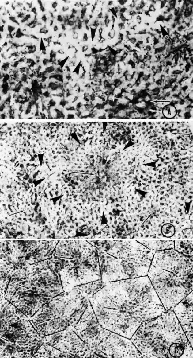 Choriocapillaris There is disagreement in the literature regarding the appearance and organization of the choroidal vasculature, particularly of the choriocapillaris, in different areas of the globe (i.e., the posterior pole, equator, and periphery).27,30,36–40 Despite the controversy regarding the angioarchitecture of the choriocapillaris, one fact is evident: There is great variation in the choroidal pattern within different areas of the same eye and in eyes from different individuals. This variation may explain some of the disagreement and inconsistencies regarding the choroidal circulation. In general, the choriocapillaris appears as a single layer of broad, wide capillaries lying in a plane internal to the arteries and veins of the choroid and external to Bruch's membrane. The capillaries of the choriocapillaris measure 20 to 50 μm in diameter. The density of the capillaries is greatest in the posterior choroid.28 The capillaries of the choriocapillaris appear as a continuous meshwork or reticulation, with intervascular spaces denoted as columns or septa. The choriocapillaris supplies oxygen and nutrients to Bruch's membrane and the outer third of the retina, except in the macula, where it supplies the entire retina. It is slightly flattened under Bruch's membrane, providing a large surface area for metabolic exchange, whereas the external floor (scleral surface) of the capillaries is gently undulating. Arterioles and venules join the choriocapillaris from the external surface, either perpendicularly or obliquely, or they come to lie in the same plane of the choriocapillaris and join the capillaries directly or at right angles. A focus of the controversy regarding the choroidal circulation is the organization of the choriocapillaris layer. Currently, the widely accepted concept of the choriocapillaris circulation and anatomy is based on work first presented in the early 1970s. Based on observations of fluorescein angiograms in monkeys, Hayreh41–43 described the choriocapillaris as a homogeneous, lobular structure with a centrally located feeding arteriole and peripherally located collecting venules. Noting that fluorescence did not cross lobular borders, he concluded that the choriocapillaris had a segmental distribution and that choroidal arteries behaved as end-arteries. Weiter and Ernest30 described the anatomy of the choroidal vasculature using vascular casts injected with neoprene latex. By observing the vascular filling, they were able to distinguish between precapillary arterioles and venules. They found that the choriocapillaris was thickest and of greatest density in the submacular region. The choriocapillaris in the peripheral choroid was found to have a specific pattern in which a precapillary arteriole supplied a circular capillary area 1 to 2 mm in diameter. Venule drainage separated contiguous circular capillary beds, possibly resulting in effective end-arteries despite the fact that adjacent capillary beds were interconnected. This distinct choriocapillaris pattern was not evident in the equatorial and posterior choroid, where many precapillary arterioles were directly interconnected via the choriocapillaris without intervening venule drainage. Torczynski and Tso27 reported on the architecture of the choriocapillaris in the posterior pole after examining choroidal flat preparations and transverse and oblique histologic sections (Figs. 21, 22, and 23). They described the overall appearance of the posterior choriocapillaris as a series of adjoining lobules that was striking in some preparations and subtle in others. The center of the lobule consisted of a single precapillary arteriole rimmed in a thick mantle of collagen measuring 15 to 25 μm and opening perpendicularly or curvilinearly into a capillary bed that radiated an average distance of 300 to 400 μm before changing from a radial to a circumferential direction. The circumferential capillaries in the periphery of the lobule were wider and converged from several directions, forming star-like or dendritiform configurations in the plane of the choriocapillaris. Venular openings, outward bulgings of the external choriocapillaris called atria, measured 30 to 37.5 μm and were present singly and in linear sequences underlying the circumferential capillaries. The often incomplete lobules varied in their geometric configuration, having three to six sides and ranging in area from 420 × 605 μm to 800 × 1200 μm. The lobular unit was thought to provide a preferred outflow route via the perimeter of postcapillary venules so that cross-flow from lobule to lobule would not normally occur, and thus the precapillary arteriole would function as an end-arteriole.