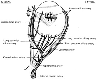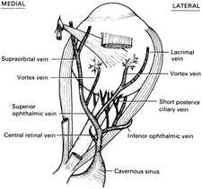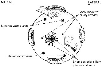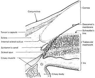 Tenon's capsule, the fascial sheath of the eyeball, supports the eyeball within the orbit separating it from the orbital fat and permits the eyeball movement produced by the extraocular muscles.21 Tenon's capsule is a membrane that extends anteriorly from the limbus backwards to ensheath the extraocular rectus muscles. Posteriorly, it envelopes the globe and fuses with the optic nerve dural sheath and with the sclera around the exit of the optic nerve. Close to the optic nerve, Tenon's capsule is penetrated by the long and short ciliary nerves and vessels, and by the vortex veins. It is closely connected to the underlying outer portion of the sclera or episclera by delicate lamellae, particularly at the limbus and at the muscle tendon insertions anteriorly and at the optic nerve dural sheath posteriorly. Tenon's capsule is thin at the limbus but becomes thicker about 3 mm backward until over the muscle tendon insertions. After being penetrated by the tendons of the six extraocular muscles, Tenon's capsule reflects on each tendon, forming a tubular sleeve. The tubular sleeves for the medial and lateral recti attach to the lacrimal and zygomatic bones, respectively; because they limit the action of these muscles on the eyeball they are called the medial and lateral check ligaments. Behind the muscle insertions Tenon's capsule becomes thinner except in the inferior part of the eyeball from one check ligament to the other where it thickens to form the suspensory ligament of Lockwood. Tenon's capsule is very thin posteriorly, especially at the optic nerve where it fuses with the dural sheath and with the sclera. Scleral Foramina Anatomically the sclera forms an incomplete sphere interrupted by two foramina, one anterior for the cornea and the other posterior for the optic nerve. ANTERIOR SCLERAL FORAMEN. The anterior scleral foramen is an anatomic concept of the sclera without the cornea. It is funnel shaped with an elliptical appearance externally (horizontal diameter of 11.6 mm and vertical diameter of 10.6 mm) and a circular appearance internally (diameter of 11.6 mm). The sclera merges with the cornea at the anterior scleral foramen forming the corneoscleral junction or limbus, an area measuring approximately 1.5 to 2 mm wide that has a convex corneal side and a concave scleral side; the scleral side is formed by the external scleral sulcus in its outer surface, and by the internal scleral sulcus in its inner surface (Fig. 4). The external layers of the internal scleral sulcus merge with the stroma of the cornea. The internal layers of the internal scleral sulcus contain the trabecular meshwork and Schlemm's canal anteriorly, and the scleral spur posteriorly; the trabecular meshwork merges with Descemet's membrane. Because the scleral spur attaches to the meridional ciliary muscle, tension on the scleral spur by the muscle opens the trabecular meshwork.23 POSTERIOR SCLERAL FORAMEN. The sclera allows the exit of the optic nerve through the posterior scleral foramen. The posterior scleral foramen also is funnel shaped but in the sense opposite to the anterior scleral foramen: the external diameter is of 3 to 3.5 mm and the internal diameter is of 1.5 to 2 mm. The site of this perforation is located 3 mm medial to the midline and 1 mm below the horizontal meridian. In this region the outer two thirds of the sclera continue backward along the nerve to blend with the dural and arachnoid sheaths of the optic nerve. The inner third of the sclera provides small perforations covered by glial tissue that allow the passage of the axons of the optic nerve. This sievelike area, which is slightly concave and faces inward, is known as the lamina cribrosa.24 After piercing the lamina cribrosa, the axons of the optic nerve become myelinated. One of the small perforations is larger than the rest and permits the passage of the central retinal artery and vein. Because the lamina cribrosa is a relatively weak area, it tends to bulge outward with an increase of intraocular pressure, forming a cupped disc. Here also, since the axons of the optic nerve and the vessels are enclosed within tiny perforations covered by glial tissue, inflammatory swelling easily leads to axonal and vessel strangulation. Layers of the Sclera The sclera may be divided into three layers: the episclera, the scleral stroma, and the lamina fusca. THE EPISCLERA. The episclera is the superficial aspect of the sclera that is continuous superficially with Tenon's capsule and merges with the underlying scleral stroma. Unlike Tenon's capsule, it has the bundless of collagen circumferentially arranged; and unlike the scleral stroma, it has a rich blood supply anteriorly. The loosely and circumferentially arranged bundles of collagen intermingle with fibroblasts, melanocytes, elastic fibers, proteoglycans, and glycoproteins. The rich blood supply anteriorly is derived from the anterior ciliary arteries and has tight attachments to the subconjunctival tissue, the rectus muscle insertions, and Tenon's capsule. The scanty blood supply equatorially and posteriorly is derived from the posterior ciliary arteries and has loose attachments to the subconjunctival tissue and Tenon's capsule. The episclera is thickest anterior to the rectus muscle insertions and becomes progressively thinner toward the back of the eye. THE SCLERAL STROMA. The scleral stroma also consists of bundles of collagen intermingled with fibroblasts, melanocytes, elastic fibers, proteoglycans, and glycoproteins. However, the bundles of collagen are thicker, the fibroblasts are thinner, and the proteoglycans and glycoproteins are scantier than those in the episcleral collagen bundles. Unlike corneal collagen bundles, the thickness of the fibrils in scleral stroma varies in each bundle. The bundles of collagen interlace greatly with each other, giving to the sclera strength and resiliency. In the superficial layers of the scleral stroma the anterior circular arrangement and the posteri