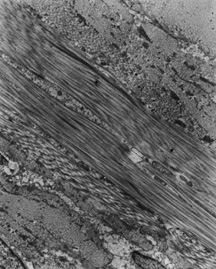 The developmental process of the human sclera progresses from anterior to posterior and from inside to outside.4 The human eye develops early in week 4 as an evagination from the ventral lateral aspect of the neural tube or neuroectoderm at the level of the forebrain in the diencephalon. The end of the evagination becomes slightly dilated to form the optic vesicle. At the same time a small area of surface ectoderm overlying each optic vesicle thickens, forming the lens placode, which invaginates to become the lens vesicle. At this time there are three waves of neural crest mesenchymal invasion. The first is responsible for the corneal endothelium and trabecular meshwork, the second for the corneal and scleral fibrocytes, and the third for iris and choroidal stroma. By week 5 of development each optic vesicle invaginates to form the double-layered optic cup or neuroectoderm that is surrounded by neural crest which is also of ectodermal origin. The differentiation of neural crest cells into sclera and choroid occurs by week 6 of development in humans in the region anterior to the equator (about day 43 of development),5 progresses backward to the equator by week 8, and reaches the posterior pole by week 12.1 This differentiation is induced by the retinal pigment epithelium.6–8 The sclera as well as the choroid and the retinal pigment epithelium requires the presence of the developing lens for normal growth and change in shape, structure, and function.1 By the 4th month circularly oriented scleral fibers form the scleral spur, and by the 5th month scleral fibers around the axons of the optic nerve form the lamina cribrosa.1,4 Arrest of fetal development at this stage or the failure to lay down new collagen on the inner aspect of the posterior sclera might well account for some of the staphylomatous changes found in congenital myopia and disc changes found in some patients with congenital glaucoma. Ultrastructural studies show that developmental events of the sclera begin in the region anterior to the equator at approximately day 43.4,5 The late mesenchymal cells or very early fibroblasts of the anterior portion possess elongated nuclei and many glycogen granules and lipid vacuoles whereas those of the posterior portion possess round-to-oval nuclei and few glycogen granules and lipid vacuoles. The late mesenchymal cells or very early fibroblasts of the anterior and posterior portions contain many free ribosomes and polyribosomes, as well as immature rough-surfaced endoplasmic reticulum and Golgi complex. The early fibroblasts begin the synthesis of glycoproteins, glycosaminoglycans (especially hyaluronic acid), collagen, and elastin between day 43 and 50, thus filling the intercellular space. Developmental events directed from inside outward begin at week 7.2 with a marked increase in the inner portion in glycogen granules and lipid droplets of the cells, and in number and average diameter of collagen fibrils. Cytodevelopment of the sclera is characterized by decrease of ribosomes, polyribosomes, glycogen granules, and lipid vacuoles, and by increase of rough-surfaced endoplasmic reticulum and Golgi complex components. Development of intercellular substances is characterized by an increase in the number and average diameter of collagen fibrils (Fig. 1) and in the amount of elastic deposits with electron-translucent central cores. By week 10.9 there are no more differences between the inner and outer portions. By week 13 there are no more differences between the anterior and posterior portions. By week 24, fetal sclera has the same ultrastructural characteristics as adult sclera. Between week 6 and week 24 there is a threefold increase in thickness, possibly by progressive laying down of collagen fibrils on its inner aspect as more mature collagen fibrils are found in the outer part of the sclera and the younger smaller collagen fibrils on its inner aspect; thereafter the rate of increase diminishes rapidly. Defects in synthesis of extracellular matrix components during scleral development may account for conditions such as Marfan syndrome, osteogenesis imperfecta, pseudoxanthoma elasticum, Ehlers-Danlos syndrome, congenital myopia, and nanophthalmos. Immunohistochemical studies show that the extracellular matrix of fetal sclera has the collagens I, III, IV, V, and VI, the glycosaminoglycans dermatan sulfate, heparan sulfate, hyaluronic acid, and chondroitin sulfate, and the glycoproteins fibronectin, vitronectin, and laminin.9 Collagens II and VII are not present. Collagens play a major role in strength (collagen I), resiliency (collagen III) and structural integrity (collagens IV, V, VI); glycosaminoglycans in distensibility; and glycoproteins in cell adhesion, growth, differentiation and migration, as well as in other extracellular matrix component organization. Collagen VIII may also be present in human fetal sclera.10 Development of scleral extracellular matrix from fetus into the adult includes increase of collagens I, III, and VI, and decrease of collagen IV and VIII, hyaluronic acid (Fig. 2), fibronectin, vitronectin, and laminin.9,10 By the time the tissue is mature, collagen IV, although abundant in fetal tissue, has almost completely disappeared, except in blood vessels. Heparan sulfate is identified in fetal and adult sclera in small amounts. Increase of collagens I, III, and VI may account for the increase in strength, resiliency, and structural integrity of adult sclera. Decrease of hyaluronic acid may explain the decrease of distensibility of adult sclera. Decrease of fibronectin, vitronectin, and laminin may suggest they play a major role in directing developmental events during the younger gestational periods, including cell and extracellular matrix organization. POSTNATAL DEVELOPMENT AND AGE-RELATED CHARACTERISTICS Scleral development is determined by the genetic signaling to the fibrocytes of the sclera, and by the concomitant development of the adjacent structures such as