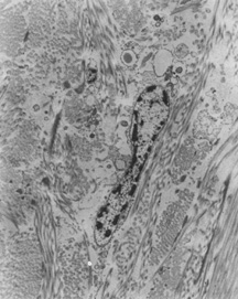 Nerve Supply The nerve supply of the sclera is surprisingly rich for a structure whose main function is protective. All the ciliary nerves are mixed nerves carrying motor, sensory, and autonomic nerve fibrils to and from cornea, sclera, ciliary body, iris, and choroid. The posterior ciliary nerves perforate the sclera around the optic nerve. The many short posterior ciliary nerves supply the posterior region of the sclera while the two long posterior ciliary nerves supply the anterior portion. The branches of the long posterior ciliary nerves end in the cornea, episclera, trabecular meshwork, and canal of Schlemm. As a result of this profuse sensory innervation, inflammation of the sclera may cause severe pain due in part for direct stimulation of the nerve endings by the inflammatory process and in part for indirect stimulation of the nerve endings by stretching secondary to edema. Since the extraocular muscles have their insertions in the sclera, the pain may increase with ocular movement. A branch of the long posterior ciliary nerve (intrascleral nerve loops of Axenfeld) enters the ciliary body and then passes outwards through the whole thickness of the sclera and back into the ciliary body through the same canal. These nerve loops, found in 12% of eyes as a normal anatomic variation, form a clinically visible nodular elevation less than 1 mm of diameter, 4 to 7 mm posterior to the limbus, often between the rectus muscle insertions superiorly or inferiorly. They are usually associated with blood vessels and with melanocytes. Because the nerve loops may produce a brown spot on the sclera, they must be included in the differential diagnosis of primary or metastatic malignant melanoma.31 Their function is unknown and, even if they are slightly painful, they should not be removed. In the episclera anterior to the vascular circle there are numerous free nerve endings staining for substance P and calcitonin gene-related peptide that are adjacent to the vessels and aqueous veins. These nerve endings may have a role in the regulation of the blood supply of the anterior segment and in the rate of aqueous outflow.32,33 Lymphatic Drainage While lymphatic channels are present in conjunctiva, they are absent in episclera and sclera. Lymph from the superficial episcleral tissue drains into the subconjunctival space and then to the parotid node nasally and to the submandibular nodes temporally. Lymph from the scleral and deep episcleral tissues drain into the deep cervical nodes through the orbit and the jugular lymph trunks. ULTRAMICROSCOPIC ANATOMY Sclera Ultramicroscopically, the sclera is composed of a matrix consisting of collagen, proteoglycans, glycoproteins, and elastin (Fig. 12). These are produced and degraded by scleral fibroblasts. Collagen bundles consist of long branch fibrils with a macroperiodicity of about 64 nm (range, 35 to 75 nm) and a microperiodicity of 11 nm. Unlike the uniform corneal collagen, the collagen fibrils in sclera vary in diameter ranging from 28 to 300 nm, and their arrangement in the individual bundles is more random than that of the cornea.34 Collagen bundles in sclera vary in diameter ranging from 0.5 to 6.0 μm and form complex and irregular branching patterns, curving around the muscular insertions and the optic nerve. Collagen bundles in the outer region are thinner (0.5 to 2 μm) than those in the inner region; they usually run in a lamellar fashion whereas those in the inner region are interwoven randomly forming irregular and intermingled arrangements. These arrangements may account for the rigidity and flexibility against changes in intraocular pressure and for the opacity of the sclera. The turnover rate of scleral collagen is unknown but the healing of the wounds in scleral injuries is a slow process that takes months or years. Many ultrastructural studies of scleral collagen fibrils have been carried out using transmission electron microscopy (TEM) and scanning electron microscopy (SEM), and more recently by atomic force microscopy (AFM), generally showing good agreement on collagen fibril dimensions. Different periodicities of scleral fibril of 67 nm have been identified by AFM and attributed to different inclination angle (5 degrees) of microfibrillar components.35,36 The fibrils at the emissary canals run parallel to the direction of the canal. Few of these fibrils attach to the wall of the vessel or nerve in the canal. A small amount of fine elastic fibers (10 to 12 nm in diameter) lie parallel to the collagen fibrils.37 The interdigitations are especially dense and the sclera thickest around the posterior pole, presumably to hold that area rigid; they thin out again near the optic disc but some fibrils pass across the disc at the lamina cribrosa. Flat stellate or spindle-shaped cells, the fibroblasts, are few in number along the bundles of collagen (Fig. 13). The long axis of the cell and the large elliptical nucleus is parallel to the surface. The nucleus has one or two nucleoli and the chromatin is sparse. Quiescent fibroblasts contain a relative scanty cytoplasm with long mitochondria, a small Golgi complex, a few cisternal profiles of granular endoplasmic reticulum and occasional small fat droplets; however, in growing or repairing processes, the Golgi complex and the granular endoplasmic reticulum become prominent. The fibroblast elaborates the precursors of the amorphous ground substance components as well as the fibrillar proteins such as collagen and elastin. After secretion, the fibrils lie on the cell surface while full maturation occurs. The amorphous ground substance composed of proteoglycans and glycoproteins fills intercellular and interfibrillar spaces. Proteoglycans, demonstrated by cuprolinic blue stain, are fine filaments of approximately 54 nm in length and 5 nm in diameter that are localized around, along, and radiating from the collagen fibrils.38 Vessels Unlike elastic arteries (large-sized vessels), muscular arteries (mediu