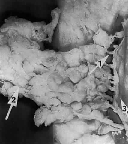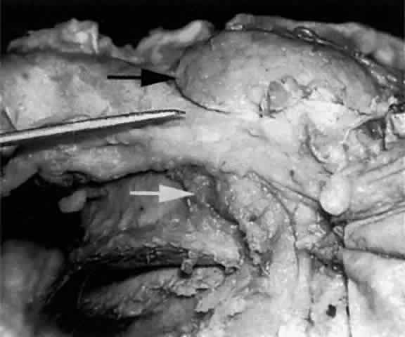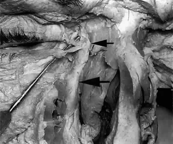 The palpebral lobe is primarily attached on its underside to conjunctiva and to the intermuscular membrane between the superior and lateral rectus muscles. Only medially is it separated from conjunctiva by the superior tarsal muscle of Müller ( Müller's muscle). The parenchyma of the gland is made up of small lobules separated by a fine connective tissue network. The lacrimal gland has approximately 12 secretory ducts (Fig. 7), which average 0.66 mm in diameter and 2.31 mm in length.4 Two to five of them originate from the orbital lobe and six to eight from the palpebral lobe. The ductules from the orbital portion of the lacrimal gland pass through the parenchyma of the palpebral lobe before exiting into the superotemporal portion of the conjunctival fornix 4 or 5 mm above the upper border of the tarsus. One or two may open near the lateral canthus.5 Excision of the palpebral lobe may therefore interrupt drainage from the orbital lobe as well. Sanderson and Stasior4 found islands of “peripheral” lacrimal glandular tissue below the lateral canthus unassociated with the main gland in 60% of cadaver specimens (Fig. 8). These peripheral islands of glandular tissue were found less commonly in or above the lateral canthal tendon. The Accessory Lacrimal Glands The accessory lacrimal exocrine glands of Wolfring and Krause structurally resemble the main lacrimal gland but on a lesser scale. Between 20 and 40 glands of Krause are located in the superior conjunctival fornix; 2 to 8 are located in the inferior conjunctival fornix. Between 3 and 20 glands of Wolfring can be found along the upper border of the superior tarsus, 1 to 4 below the lower tarsus and an occasional gland in the caruncle and in the plica semilunaris. The glands of Wolfring are larger in size than glands of Krause.4–6 Jones7 termed the accessory lacrimal glands the basal secretors because they do not possess direct secretory motor fibers. The other basal secretors are the sebaceous glands (meibomian and Zeis) and the mucous glands (goblet cells). The reflex secretors are the main lacrimal glands. Reflex secretion provides additional secretion by peripheral sensory (fifth nerve efferent, seventh nerve afferent), retinal or psychogenic stimulation. VASCULAR SUPPLY TO THE SECRETORY APPARATUS The lacrimal gland receives its arterial supply from the lacrimal branch of the ophthalmic artery, which enters the gland near its posterior margin. An additional arterial supply is often seen from the infraorbital branch of the internal maxillary artery. The lacrimal artery divides within the gland and continues anteriorly to form the lateral palpebral pretarsal arterial arcades of the eyelid. Venules form a lacrimal vein (Fig. 9) which exits the gland near its posterior margin. The lacrimal vein follows a similar intraorbital course as the lacrimal artery, superior to the lateral rectus muscle and lateral to the superior rectus muscle, before it drains into the superior ophthalmic vein and eventually into the cavernous sinus. Lymphatic drainage from the lacrimal gland enters the conjunctival and palpebral systems to drain into the preauricular nodes. NERVE SUPPLY TO THE SECRETORY APPARATUS The lacrimal gland is richly innervated by the lacrimal nerve (sensory), the facial nerve (parasympathetic), and the sympathetic nervous system. The lacrimal nerve carries sensory fibers from the lacrimal gland and is one of the three branches of the ophthalmic division of the trigeminal nerve (cranial nerve V1). Afferent sensory fibers of the lacrimal nerve leave the lacrimal gland posteriorly near the lacrimal vessels (Fig. 10). Sensory fibers of the lacrimal nerve traverse the orbit superotemporally, along the superior border of the lateral rectus muscle, remaining outside the muscle cone. They leave the orbit through the superior orbital fissure, then pass through the cavernous sinus. Their cell bodies are found in the gasserian ganglion.