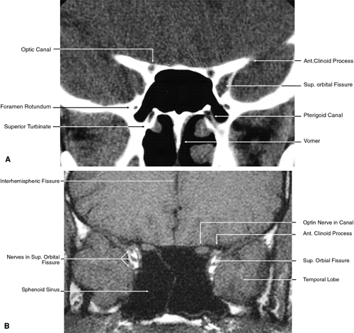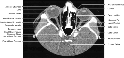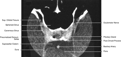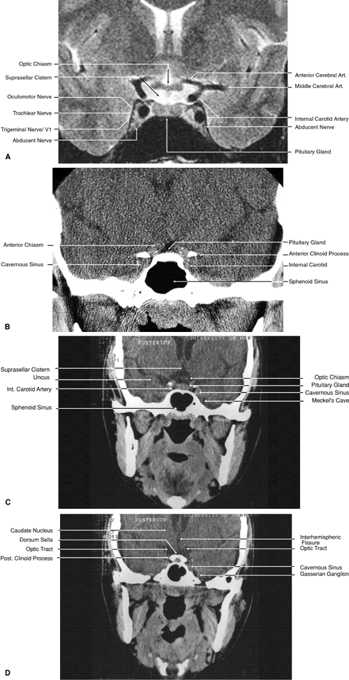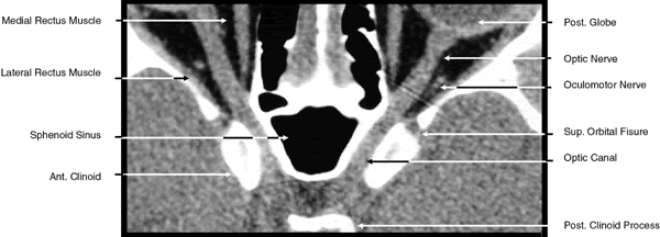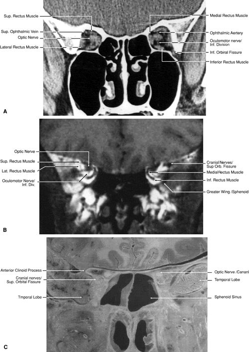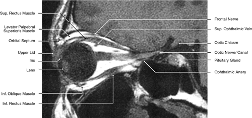 images.1,43–47 The globe is shown in Figure 12. The orbit and periorbital structures are shown in Figures 13 through 16, and the optic canal is shown in Figures 17 through 26. The cavernous sinus and optic chiasm are shown in Figures 27 and 28, and the posterior visual pathway and cranial nerves are shown in Figures 29 through 33.