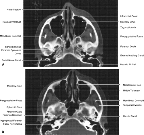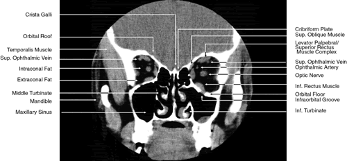Multiplanar reconstructions are frequently used to provide imaging in the coronal, sagittal, and oblique planes in both orbital and cranial CT.12–14 As already noted, multiplanar reconstruction is also required for the formation of 3D images.8 These reconstructions are computer-generated from consecutive or overlapping transverse images, with the reconstructed image based on the volume (i.e., the individual voxels) of the tissue slice scanned. The resolution of these images depends on the number of slices imaged and their thickness and on the extent to which individual slices overlap. Multiplanar reconstruction is very useful in patients who cannot remain still for any length of time, who are medically or surgically unstable, who have limited mobility, or who have been injured traumatically, because this technique avoids the repositioning required for direct coronal and sagittal scanning and reduces the time needed to obtain a scan. This technique is also quite helpful when dental or other metallic appliances are present, because these items reflect or disperse radiation, resulting in significant imaging artifacts. Direct multiplanar CT imaging provides a much improved image over those obtained through multiplanar reconstruction (Fig. 4). This technique is “slice-oriented” in that each image is obtained directly by scanning in a plane perpendicular to the tissue slice whose image is desired. In contrast, multiplanar reconstruction is “volume-oriented” in that the reconstructed images are based on the total volume of tissue imaged in one particular, usually axial, plane. Direct coronal and sagittal CT scanning requires special patient positioning that may not be possible for all patients.1,5,6,15 However, the images produced by direct scanning have significantly higher spatial resolution and quality than those produced by multiplanar reconstruction. In addition, such direct scans avoid imaging artifacts caused by eyelid and ocular movement that often occur in imaging by multiplanar reconstruction. On the other hand, imaging artifacts caused by dental appliances are often present on direct coronal and sagittal scanning. Generally, direct coronal scanning should be obtained, whenever possible, to supplement axial orbital scans to image this area most accurately (Fig. 5). Direct multiplanar imaging of the orbit and optic nerve is particularly helpful in instances of ocular and orbital trauma and in cases in which evaluation of the extraocular muscles, optic nerve, chiasm, canal, and perisellar or cavernous sinus areas is desired.