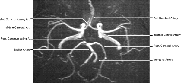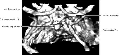 The use of intravenous iodinated contrast agents is particularly useful in showing areas of increased vascularity or breakdown in the blood-brain barrier. For these reasons it should be employed routinely when there is a need to evaluate visual loss or there is suspicion of infarction, mass lesions, inflammation and infection, or demyelinization. On the other hand, the high contrast between the vitreous, sclera, orbital fat, extraocular muscles, optic nerve, surrounding bony structures, brain, and cerebrospinal fluid reduces the need for intravenous contrast dyes in routinely imaging these structures. Generally, contrast agents are not employed in cases of intracranial, orbital, and bony trauma. In addition, further enhancement of specific structures can be obtained by manipulation of the screen image display (that is, the area scanned that appears on the technician's video display screen is subsequently recorded onto film). To display soft tissue structures optimally, a window level between 0 and 40 HU is used, with a window width between 300 and 600 HU being most appropriate. Bony structures are optimally displayed with a window level between 40 and 300 HU and a window width between 2400 and 3200 HU.1 MULTISLICE SPIRAL/HELICAL CT AND CTA Newer generations of scanners introduced in the last decade combined with advances in 3D imaging software and hardware have revolutionized the field of CT imaging. Multislice CT, introduced in 1998, has taken CT from an axial cross-section imaging technique to a real 3D imaging tool: near-isotropic resolution is now possible with almost identical spatial resolution along all spatial axes, including the patient's long axis.3,16,17 As a consequence, excellent multiplanar reformats can be obtained as well as high-quality 3D reconstructions of anatomical structures. The principal difference between multislice CT scanners and the single-slice spiral/helical scanners lies in the detector array. Two major changes were made in the scanner detectors. The detector array is configured to operate with a slip ring that allows it to rotate continuously. The rotation time for the x-ray source and detectors, formerly about 1 second for most scanners, has been reduced to 0.5 seconds. More importantly, the single detector row was replaced by four rows of detectors capable of simultaneously collecting data at different slice locations. By doubling the rotation speed and providing four times the detector rows, the data acquisition capability dramatically increases. The net is a scanner that operates four to eight times faster than its predecessors. The enhanced speed of the multislice CT scanner translates into several dramatic changes in routine practice. Because of this markedly improved speed, it is possible to choose to decrease slice thickness up to 0.5 mm to allow improved spatial resolution. Conversely, it is also possible to choose to image a larger volume and increase anatomical coverage. It is also possible to obtain images with less motion blur and artifact, decrease the need for sedation in children and noncooperative patients, decrease scanning time in trauma patients, and reduce the amount of contrast being used. Reduction in radiation exposure is also achieved. With multislice CT, there is now the option to obtain information that was not previously available. Not only axial and coronal but also sagittal images of the brain can be obtained. Thin-section scanning of the posterior fossa can be used for reduction of beam hardening artifacts and improved delineation of the brain stem. Perhaps the most important application of spherical multislice CT is the 3D reconstructions of blood vessels that have enabled significant improvements of CTA. CTA is defined as any CT image of a blood vessel that has been opacified by a contrast medium. During spiral data acquisition, the entire area of interest can be scanned during the injection of contrast. Images can be captured when the vessels are fully opacified to show either arterial or venous phase enhancement through the acquisition of both data sets (arterial and venous). CTA acquires an entire volume of 3D data using a single injection of contrast agent. This database is then processed using special 3D software to create a 3D image of the blood vessels. Areas of interest can be retrospectively targeted and reconstructed without the need for additional iodine or x-ray exposure. Overlying structures may be eliminated by postprocessing of the image.16,17 CTA also has the ability to depict mural thrombus calcifications and true mural dimensions. CTA of the intracranial vessels is an excellent tool for detecting cerebral aneurysm in patients with subarachnoid hemorrhage (Fig. 6). Compared with a standard cranial CT, it requires only a few more minutes to obtain detailed information about intracranial angiography. CTA obtained with multislice CT is a relatively new technology with promising implementations, but at present the clinical usefulness of multislice CT and CTA in neuroimaging is yet to be determined.