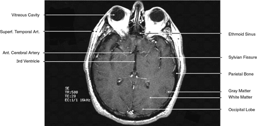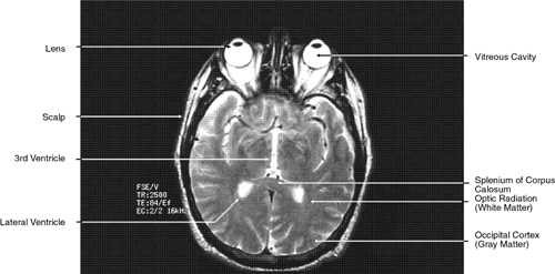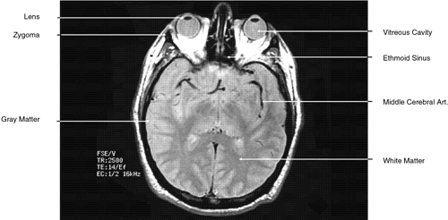 T2-weighted images can be produced at the same time as proton density images. In this case both the TR and TE are prolonged. By allowing all tissues to relax maximally, the most intense signal will be produced by the tissue with the longest T2 (that is, the tissue that remains coherent the longest). A particular tissue's T2, which typically ranges between 25 and 150 msec, is usually much shorter than its T1. To obtain a T2-weighted image, both the TR (>2,000 msec) and the TE (50 to 150 msec) are long (Fig. 9). In such cases, vitreous and cerebrospinal fluid give the most intense images and fat, white and gray matter, bone, and air give the least intense images.