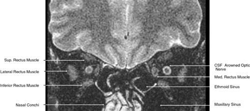In addition to varying TR and TE, the sequence of radiofrequency pulses can also be manipulated to improve image contrast and clarity. Pulse sequences are usually repeated 128 or 256 or more times to achieve enough signals to form an image, with a single pulse sequence varying between approximately 0.3 and 2 seconds.26 The most common pulse sequence currently in use is the spin-echo sequence in which, as already noted, a pulse of sufficient magnitude is applied to rotate the magnetization vector of the affected protons 90 degrees from the transverse axis of the strong static magnetic field. Inversion recovery (IR) sequencing is a technique that uses a pulse of sufficient magnitude to rotate protons 180 degrees. This is followed by another pulse sufficient in magnitude to rotate these protons 90 degrees after they have partially recovered their longitudinal magnetization. Using this technique, a null signal can be obtained when this second 90-degree pulse is applied to the partially recovered protons at the time (the inversion time or TI) their magnetization vector is at the crossover point where their emitted signal can be negated. The IR technique is of particular benefit when suppression of the signal from fat is desired; in this context it has been used in orbital imaging (Fig. 10).27 However, because routine spin-echo techniques provide excellent orbital images and because the IR technique makes it difficult to separate cerebrospinal fluid from optic nerve and also creates an imaging artifact at interfaces of fat and water, this technique has not gained wide acceptance. A variety of other techniques, some still experimental, have also been developed to suppress the signal associated or in attempts to evaluate lesions associated with various degrees of vascular flow.10 However, the spin-echo technique provides a superior image to most of these and is currently the most commonly used MR technique. Other factors are also important in ensuring that the clearest MR image is obtained.26 Most revolve around improvements in the signal-to-noise ratio (SNR). Generally, the greater the SNR, the better is the quality of the MR image. MR equipment factors, including the strength and quality of the gradient and static magnets, and the size and placement of the signal detectors (in particular, the use of small surface coils), are intimately related to image quality. Equally important is scanning technique and patient cooperation and preparation. Except for the strength of the superconducting static magnet, the operator of the MR equipment can adjust all aspects of a particular scan, including the TE, TR, and pulse magnitude, repetition, and sequence to improve the SNR. For example, doubling the number of proton excitations will boost the emitted signal by a factor equal to the square root of 2. However, this will also double the scan time, which can lead to patient agitation and imaging artifact. The SNR can also be improved by adjusting the field of view, tissue slice, and pixel size. Normally the field of view varies between 8 and 20 cm while the size of the pixel matrix (that is, the number of pixels in the two dimensions[x, y] of the field of view) is usually 128 × 256 or256 × 256. The usual individual pixel size variesfrom 0.31 × 0.31 mm in an 8-cm field of view to1.56 × 0.75 mm in a 20-cm field of view. Thinner slices and smaller fields of view and pixel sizes are associated with lower SNRs. This is due to the reduced number of protons excited in a particular voxel and, therefore, a reduction in the signal they produce. However, if the tissues to be imaged are already small, as, for example, are the orbital structures, the spatial resolution can be improved by reducing the field of view even though there is also a subsequent reduction in the SNR. Although the SNR is linearly related to slice thickness and pixel size, it is adjusted in proportion to the square of the field of view. Therefore, all other factors being equal, a 75% reduction in SNR occurs with a 50% reduction in the field of view. On the other hand, there is a trade-off when the image slice becomes too thick. Although this will result in a linear increase in the SNR, there will also be an increase in partial volume effects with a subsequent degradation of the MR image. For MRI of the orbit, a slice thickness of 3 or 4 mm is routinely used with an interslice distance of 0.5 to 2.0 mm, whereas for intracranial imaging slice thickness of 3 to 5 mm and interslice distances of 05 to 2.5 mm are routinely employed.11 In addition, because MRI is multiplanar, direct views from several different planes (coronal, sagittal, oblique, and axial) can be obtained routinely during a single imaging session without repositioning or rescanning a patient. The SNR can also be increased by averaging the signal responses from repeated excitations of individual tissue volumes. Because this also increases the scan time and the incidence of movement artifact, especially when the eye and orbit are imaged, the number of excitations that can be performed is limited before image degradation occurs. Generally, one excitation (corresponding to 128 pulse sequences) is used for routine imaging, although signal averaging of as many as four excitations (corresponding to 1,024 pulse sequences) is possible. The most effective method for improving the SNR for orbital imaging is with the use of surface coils for receiving emitted MR signals.28 These coils are smaller than the normal head coil and rest over the orbit. They can receive strong signals from immediately adjacent areas while limiting the signals received from more distant areas. This permits the use of thin tissue slices and smaller fields of view. Although the use of surface coils can dramatically improve the image resolution of orbital structures, the optimal depth of their use is approximately the orbital apex. The other drawback to their use is that they are more sensitive to motion artifact. For this