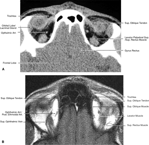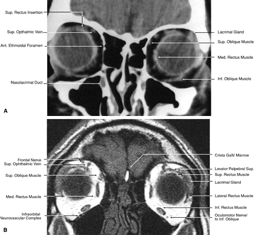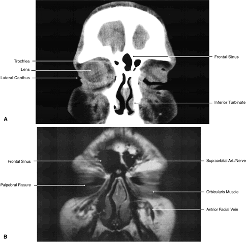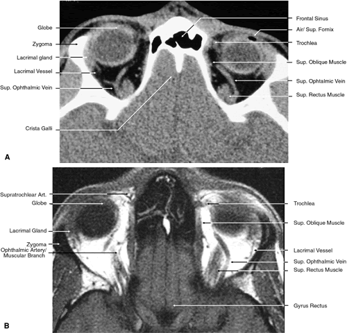 GLOBE Both MRI and CT are limited in their ability to image clearly the normal intraocular structures (see Fig. 12). For the most part this is due to the small size and ultrastructural composition of these structures. The cornea and sclera cannot be differentiated from each other but are quite distinct on both MRI and CT owing to their contrast with both the vitreous and aqueous internally and the orbital fat and, if present, air trapped behind the eyelids externally. The only other readily visible intraocular structure is the lens. On CT this appears uniformly dense and similar in appearance to the sclera. However, on T1-weighted MRI, the external lens capsule can be clearly differentiated from the internal lens structure owing to the presence of a significant number of hydrogen proteins within the central portion of the lens. In addition, the normal choroid, ciliary body, and iris can occasionally be visualized on MRI but not on CT. The normal retina cannot be seen by either technique; neither can the conjunctive, Tenon's capsule, angle structures, or the vessels and nerves penetrating the globe. ORBIT AND PERIORBITAL STRUCTURES The bony orbital and periorbital anatomy is best visualized with CT, whereas the soft tissue anatomy can be visualized with either CT or MRI. The orbital cavities are roughly shaped like quadrilateral pyramids parallel to each other medially and lying on one side with their apex facing posteriorly. The widest portion of the orbit is approximately 1.5 cm posterior to the orbital rim (see Fig. 2). On average the adult orbit is 40 to 45 mm deep, with the anterior orbit measuring 40 mm wide and 35 mm high. The interorbital distance in the normal adult is 25 mm. In contrast, the newborn orbit is more rounded, with a width and height of 27 mm, and the orbit of a 7-year-old measures 28 mm high and 33 mm wide.48 The orbital volume is approximately 30 mL, in comparison to the globe, whose diameter of24 mm gives it a volume of 6.5 to 7.0 mL. The orbital roof is approximately triangular and is composed of the frontal bone anteriorly and the lesser wing of the sphenoid posteriorly. The roof is markedly concave, with the greatest degree of this concavity in the area of the equator of the globe (see Fig. 26). At the anterior and lateral portion of the orbital roof lies the lacrimal gland in the lacrimal fossa (see Figs. 18 and 23). This gland consists of a large orbital portion and a smaller palpebral portion. The orbital portion normally measures 20 × 12 × 5 mm, whereas the palpebral portion is about one third of this size.49 The supraorbital notch is at the junction of the nasal third and the lateral two thirds of the bony orbital margin (see Fig. 1). The trochlea of the superior oblique muscle is located 4 mm posterior to the orbital margin in the medial and anterior portion of the orbital roof (see Figs. 17, 24, and 25). Although usually a cartilaginous structure, it is occasionally partially or wholly ossified. It measures 4 × 6 mm and is firmly attached by connective tissue to the periosteum. The frontal bone portion of the orbital roof is extremely thin and like the orbital floor is subject to so-called blow-in fractures as well as to penetrating injury.50 The posterior portion of the roof is more substantial, measuring 3 mm thick. Except for the anterior portion of the orbit, the intracranial cavity lies directly superior to the orbital cavity (see Fig. 26). The levator muscle and the superior rectus muscle just inferior to it are present along the midportion of the orbital roof for all but its most anterior portion (see Fig. 26). The superior oblique muscle, after it changes direction at the trochlea, is present inferior to the anterior portion of the roof and inserts onto the globe inferior to the superior rectus muscle. Anteriorly and medially, the frontal sinuses are superior to the orbit and lie between the two plates of the frontal bone. Occasionally, the ethmoid air cells are also found invading the orbital roof. The frontal sinus measures approximately 3 cm high,2.5 cm wide, and 2 cm deep. This is quite variable, and it is not unusual for one sinus to be considerably larger or smaller than the other or even completely absent. The two sinus cavities are separated by a bony septum that is usually deviated to one side. Medially the ethmoid air cells and nasal cavity lie below the frontal sinuses and are separated from them by a thin wall of bone. Superiorly and posteriorly the frontal sinuses are separated from the intracranial cavity and the frontal lobes by the thin frontal bone. Immediately beneath the central portion of the orbital roof lies the frontal nerve, a branch of the ophthalmic division of the trigeminal nerve (see Fig. 18). Along with the trochlear nerve and lacrimal nerve, another branch of the ophthalmic division of the trigeminal nerve, it enters the orbit through the superior orbital fissure superior to the annular tendinous insertions of the extraocular muscles. The lacrimal nerve enters the orbit medial and superior to the superior orbital vein and travels laterally below the orbital roof and superior to the lateral rectus muscle to enter the lacrimal gland (see Fig. 24). The lacrimal artery arises from the ophthalmic artery lateral to the optic nerve and travels with the distal two thirds of the lacrimal nerve. The supraorbital and supratrochlear arteries branch from the ophthalmic artery superior to the optic nerve, passing medially to the superior rectus and levator muscles to accompany the supraorbital and supratrochlear nerves, the two branches of the frontal nerve, as they pass above the levator muscle. The supraorbital vein and artery accompany the nerve along the anterior two thirds of its course before exiting with it at the supraorbital notch. The other branch of the frontal nerve, the supratrochlear nerve, travels medially after separating from the frontal nerve at approximately the junction of the posterior one third and anteri