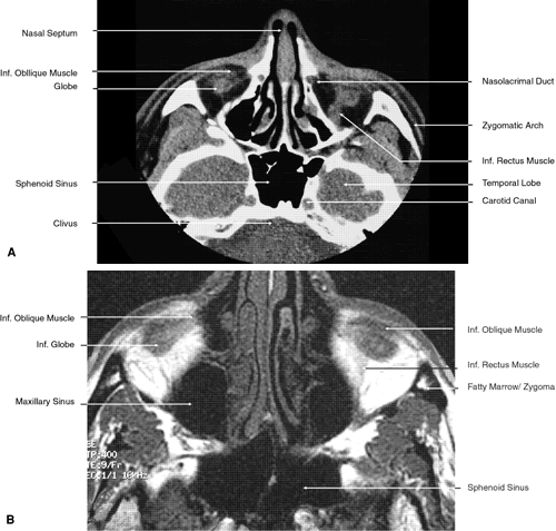 medical and surgical armamentarium and vital to patient care. During the past 30 years there have been remarkable advances in diagnostic imaging. Spatial resolution using computed tomography (CT) has improved from 4 to 0.5 mm, thus reducing the slice thickness of imaged tissue from 8 mm in the 1970s to 1.5 mm in the early 1990s.1,2 New CT scanners introduced since 1998 enable imaging that is eight times faster, with slice thickness of up to 0.5 mm.3 Through this advancement it is now possible to image such structures as the subarachnoid space around the optic nerve and individual sensory and motor nerves within the orbit. Additionally, direct multiplanar CT imaging in the coronal and sagittal planes has in many cases obviated the need for reconstructed images that invariably lack the resolution and detail of direct images.4–7 Even more recently, software advances have allowed the creation of 3D reconstructed images from thin-slice CT images.8 These include 3D reconstructions of contrast media in blood vessels, thus allowing the creation of noninvasive CT angiography (CTA). Simultaneously, during the past 10 years, magnetic resonance imaging (MRI) has achieved a level of importance at least equal to and perhaps surpassing that of CT in the imaging of orbital and intracranial structures. In part this has been the result of the decreased costs associated with this imaging modality and its more widespread availability. More important, however, is the ability of MRI to provide direct high-resolution multiplanar and 3D thin-slice images of soft tissue structures.8,9 In addition, improvements in surface coils and the introduction of fat suppression and gradient echo techniques andgadolinium-diethylenetriaminepentaacetic acid (Gd-DTPA) have further improved the imaging capabilities of MRI.10,11 As with CTA, 3D reconstructions of signals from moving protons in blood vessels have allowed the establishment of noninvasive MR angiography (MRA). For the most part, diagnostic imaging techniques such as CT and MRI are used to obtain information about various disease states. However, to understand fully the images created by these modalities, it is essential not only to have a basic knowledge of their technical aspects but also to understand how they image normal anatomical structures. The discussion that follows is designed to help the practicing ophthalmologist understand the basic scientific and technical aspects of CT and MRI. In addition, it will include a relatively comprehensive description of the normal facial, orbital, and intracranial anatomical structures and processes imaged by these techniques. |