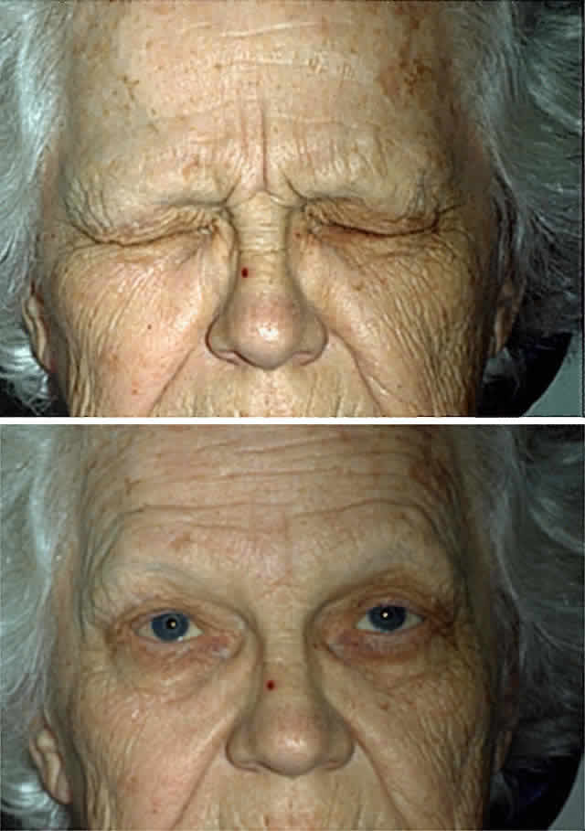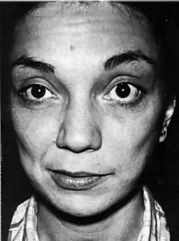Because essential blepharospasm and more widespread dystonic conditions such as Meige's syndrome probably are part of a spectrum of the same disease (cranial dystonia), clinical features, treatment, and pathophysiology will be discussed together in the next section. MEIGE'S SYNDROME (BLEPHAROSPASM-OROMANDIBULAR DYSTONIA, OROFACIAL-CERVICAL DYSTONIA, BRUEGHEL'S SYNDROME). Dystonic involvement of the lower cranial muscles (mouth retraction, jaw opening or closing, facial grimacing), neck, vocal cords (spastic dysphonia), and limbs is often referred to as Meige's syndrome.94 Also, in a study of 100 patients by Jankovic and Ford,95 a full 30% had tremor. Although the most frequent presenting sign is blepharospasm, it is not uniformly present.95,96 Full expression of the syndrome often takes many years. Initial complaints in cranial dystonia are often dry eyes, ocular pain, and photophobia. Exacerbating features include stress, bright lights, social interaction, driving, reading, watching television, and wind. Relief may be found in the morning or after rest, and by using sensory “ricks” such as touching the side of the eye, singing, humming, yawning, sucking, chewing, drinking alcohol, extending the neck, and wearing dark glasses.93,95,97 Cranial dystonia can be confused with tardive dyskinesia, which has a more choreiform movement rather than the sustained postures of dystonia, although overlap does occur. The presumed cause of cranial dystonia is an upset in the normal dopamine balance in the basal ganglia and brain stem.98–100 The reason for differences in the extent of cranial and limb involvement is not understood. Evidence for the dopamine hypothesis comes from a complicated body of literature.93,95,97,101–103 These studies have reported on (1) different responses to pharmacologic agents that exert their effect on the basal ganglia; (2) associated conditions that affect the basal ganglia and can produce secondary dystonia, including Wilson's disease, encephalitis lethargica, and levodopa or neuroleptic use; (3) associated conditions that affect the upper brain stem, including strokes and multiple sclerosis; and (4) pathologic reports of cases in which abnormalities when evident have inconsistently found gliosis and cell loss in the caudate, putamen, substantia nigra, locus ceruleus, midbrain tectum, and dentate nuclei. Satisfactory treatment for blepharospasm is best accomplished with botulinum A toxin injected into the muscles around the eye. Other muscles of the face and neck can be injected, depending on the extent of dystonia, but a satisfactory response is less likely than for pure essential blepharospasm.90,104 The presynaptic nerve terminal is the site of action, where botulinum toxin binds to acetylcholine-containing vesicles to prevent exocytosis. Muscle paralysis is the result, with a peak effect at 5 to 7 days and a duration of effect of between 10 and 16 weeks. Side effects occur in approximately 25% of patients and include ptosis, lagophthalmos, entropion, epiphora, diplopia, bruising, and lower facial weakness.90 Changes at the neuromuscular junction have been reported by several investigators,105,106 but the importance of these changes and whether or not they are reversible is debatable. Oral medications have become a second-line treatment, which is fortunate considering that most patients respond incompletely or not at all to this treatment. Several different medications have been tried, such as tricyclic antidepressants, anticholinergics, neuroleptics (including clozapine), dopamine depleters (reserpine, tetrabenazine), levodopa, cholinergics, clonazepam, baclofen, and lithium.92,95,97,107 One reason why such a varied number of drugs have been used in an attempt to treat cranial dystonia is that this disorder was initially considered a psychiatric illness. For the few patients who do not respond to pharmacotherapy, surgical options include orbicularis myectomy, peripheral facial nerve avulsion, and peripheral facial neurectomy.108 Nuclear Disorders FACIAL MYOKYMIA. The pathophysiology of facial myokymia needs to incorporate the variety of conditions known to be associated with it, including brain stem tumors, pontine tuberculoma, cerebellopontine angle tumors, carcinomatous meningitis, sarcoidosis, syringobulbia, subarachnoid hemorrhage, multiple sclerosis, Guillain-Barré syndrome, cysticercosis, timber rattlesnake envenomation, hypoparathyroidism, and cardiopulmonary arrest.109–115 Unknown specific changes in the microenvironment of the motor neuron or its axon due to edema, demyelination, toxins, ischemia, destruction, or metabolic alterations are proposed.110,111,113–115 This may be due to direct damage or disruption of regulatory neurons. Pathologic studies have documented cases of nuclear edema or damage, but other studies have also documented cases of disease above or below the facial nucleus without direct involvement.114,116 Myokymia is a continuous, undulating, involuntary movement of the facial muscles involving predominantly the periocular and orbicularis oris musculature (Fig. 8). It is usually unilateral. This movement disorder is perceived by the patient as a “nervous twitch” and rarely arises in isolation of other neurologic signs or symptoms. Spastic paretic facial contracture may accompany myokymia in intraparenchymal brain stem cases.111,117 In the absence of other obvious causes, the most likely causes are pontine glioma in children less than 10 years old and multiple sclerosis in persons older than 15. Facial myokymia should be differentiated from the transient twitches of extreme fatigue, the rhythmic contractions seen in hemifacial spasm, facial tics, focal seizures, and the synkinetic movements that follow facial palsy.