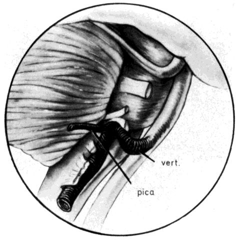 | The vascular supply of the facial nerve is complex and more fully described elsewhere.14 The posterior vertebrobasilar circulation supplies the proximal and middle portions of the nerve via the anterior inferior cerebellar artery and the internal auditory artery, respectively. Further supply of the middle portion of the nerve comes from the petrosal artery via the middle meningeal artery off the external carotid. Distal segments receive blood from the stylomastoid artery, which is also off the external carotid. The considerable overlap of the arterial supply, especially in the middle portions through the facial canal, make it unlikely that occlusion of any single artery will compromise facial nerve function.14 |