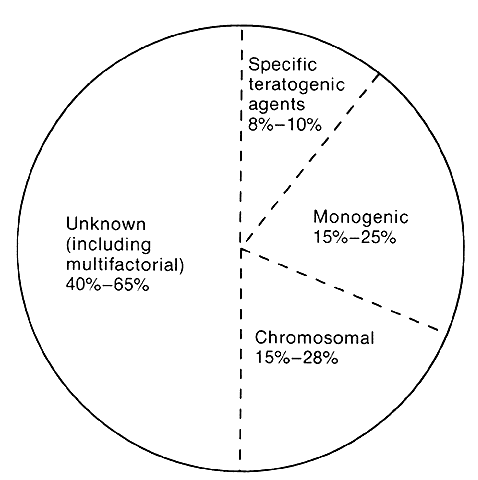 Modern genetics in the early 20th century promoted the study of congenital malformations to provide simple explanations of the etiology of human malformations previously considered untreatable and unpreventable. Modern teratology did not take shape until the middle of the 20th century. Although the adverse effects of radiation on the fetus had been recognized earlier, an ophthalmologist, Norman Gregg, discovered in 1941 that a high proportion of women infected with rubella virus during the first trimester of pregnancy gave birth to infants with defects.5 With the thalidomide tragedy in the 1960s, the field of teratology expanded quickly. Progress in medicine in the last 30 years has resulted in improved prevention and treatment of congenital malformations, although knowledge about the cause and prevention of these malformations remains extremely limited. Approximately 3% of all newborns have a congenital anomaly requiring medical attention, and approximately one third of these conditions can be regarded as life-threatening. With increasing age and detection of certain functional changes, the rate of congenital defects doubles.6 Mental retardation, which occurs in approximately 3% of school-age children, is often congenital. Preterm and stillborn infants have significantly higher rates of congenital malformations. Among spontaneously aborted embryos and fetuses, the rate of structural abnormality varies from 7% to 24%. Based on data from several teratologic researchers, it has been estimated that the causes of congenital defects are specific teratogenic agents in 8% to 10%, monogenic in 15% to 25%, chromosomal in 15% to 28%, and unknown (including multifactorial) in 40% to 65% (Fig. 2).7