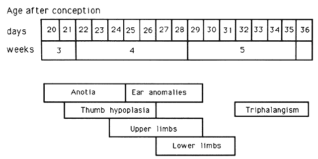 Many teratogens affect the eyes. Ophthalmologists can be very helpful in recognizing teratogenic lesions, because we are able to observe small anomalies produced during a specific short period of development. These lesions produce symptoms that can be measured by simple, fairly exact clinical methods that are neither painful nor dangerous to the child. A comparison of available detailed data on embryonic eye development in humans and animals and experimental animal research provides information regarding the periods during which the malformations were produced and the etiologic causes of the defects. In 1977 Wilson and Fraser8 described and discussed the general principles of teratology and its consequences in a way that is stilt relevant for the science. Examples of these principles include the following: