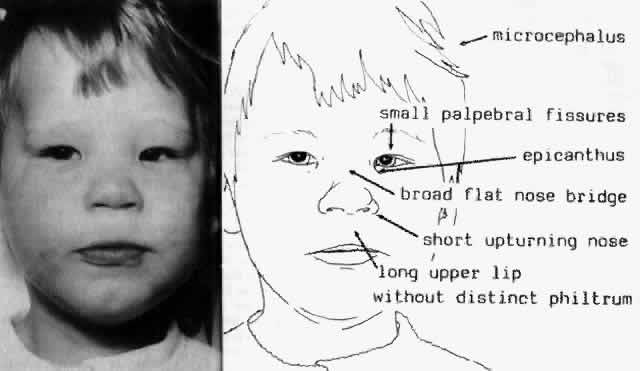 Many different organs, such as the heart, skeleton, neural tube, and kidneys, can be affected by the teratogenic effects of alcohol. 120,121 In addition to retarded mental and motor development, affected children have developmental perceptual and behavioral characteristics, a pattern that is not altered with time.118,122,123 Ophthalmic Manifestations of FAS. Short horizontal palpebral fissures are the most common findings observed in the outer eye region in FAS.124–127 Telecanthus (marked increase in the intercanthal distances between the medial canthi) and epicanthus also are frequently seen. Unilateral or bilateral, generally mild, ptosis also is common, and strabismus, most often esotropia, occurs in up to half of the cases.124–126 Microphthalmia may occur, but unless unilateral or pronounced, it is difficult to identify without biometric measurements. A high frequency of errors of refraction also is found,125,126 ranging from severe myopia to moderate hyperopia. Visual impairment is a frequent finding.125–127 A wide range of abnormalities of the anterior segments and media have been recognized among children with FAS. Microcornea and corneal opacities; anterior chamber angle abnormalities; iris defects; combinations of these malformations, such as Peters' (Fig. 6) and Axenfelds anomaly; glaucoma; cataracts; and persistent hyaloid also may be observed.124,128 A steep corneal curvature seems to be a constant sign of FAS.129