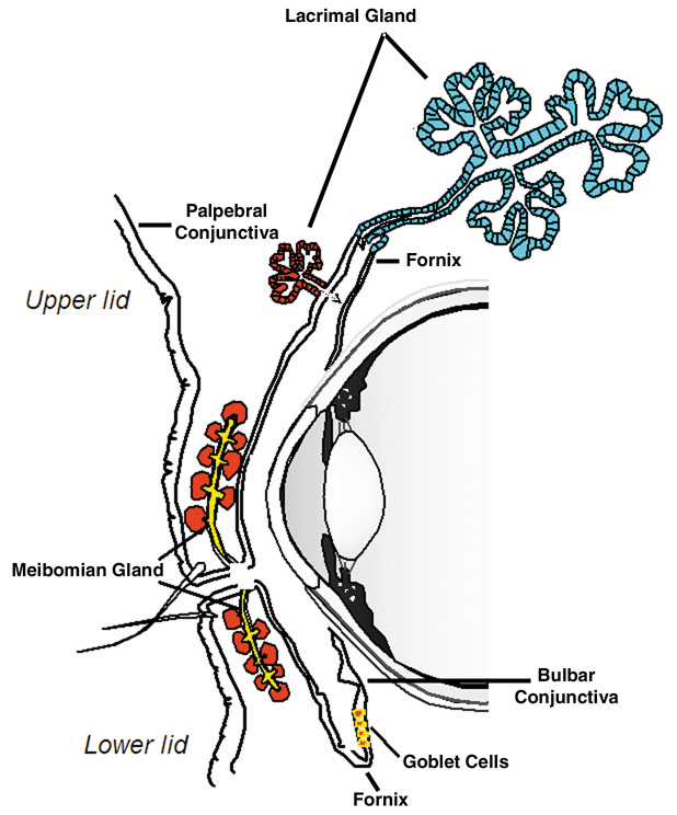 the main lacrimal gland and accessory lacrimal glands; and the outer