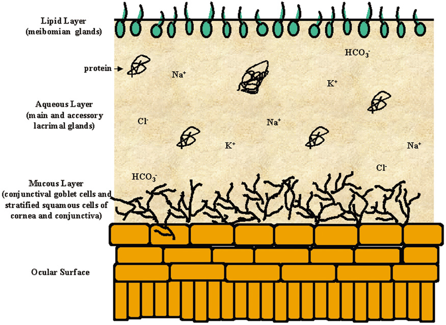 lipid layer is secreted by the meibomian glands (Fig. 1). Between the mucous layer and the corneal and conjunctival epithelia