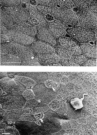 more than the temporal conjunctiva.14 The apical cells of the conjunctival epithelium are not flattened like those of the cornea. However, like the apical squamous cells of the cornea, the stratified squamous cells have a complicated arrangement of microvilli and microplicae on the apical-most membranes.15,16 The microvilli are 0.5 μm in diameter and 0.5 to 1 μm high. The microplicae are of a similar size, measuring 0.5 μm in width, 1 to 3 μm in length, and 0.5 μm in height. This system of outfoldings is present over the entire conjunctival surface, and is continued over the apical membrane of the goblet cells. In these cells the apical cell membrane disintegrates during secretion and is released into the tear film along with the secretory granule membranes and their components. After the secretory process is completed, the goblet cell resynthesizes mucin by packaging it into secretory granules that are separated from the tear film by the apical membrane. This complex system of micro-outfoldings of the surface cell membranes may aid in supporting, stabilizing, and anchoring the tear film against the effects of gravity and eyelid movement, thereby preventing irregular streams and flow patterns from developing that would interfere with clear vision. In addition, membrane-spanning mucins are inserted into the microplicae of the apical membrane to form the glycocalyx. Notable in the stratified squamous cells of the conjunctiva are numerous clear vesicles in the cytoplasm, which give the cells a lacy appearance. These vesicles contain mucin that is perhaps being transported to the apical membranes. The total surface area of an adult conjunctival sac in one eye, including the cornea, averages 16 cm2, or roughly 17 times more surface area than the cornea. Because of its large surface area, the conjunctiva may be a significant source of electrolytes and water in the tear film.17 The blood vessels and the epithelial cells of the conjunctiva may transport fluid across the conjunctiva. An increase in vascular permeability of the blood vessels may contribute fluid to tears by leaking plasma. This may occur in pathologic conditions, such as inflammation or topical application of drugs, that increase vascular permeability. Epithelial cells can also be a source of fluid for tears. Under normal conditions, the goblet cells and the stratified squamous cells are the primary sources of fluid transport in the conjunctiva. The conjunctiva can also absorb electrolytes and water.18,19 In addition, the conjunctiva absorbs drugs that are applied to the ocular surface.20 The conjunctiva is permeable to hydrophobic molecules up to 40 kDa21 and actively transports drugs using nucleoside, monocarboxylate, dipeptide, and sodium-dependent transporters.22–24 Conjunctival epithelial cells can also absorb compounds by endocytosis.25 For a comprehensive review of conjunctival fluid secretion, see Dartt.26 The conjunctival epithelium is a low-resistance, permeable epithelium, particularly in contrast to the high-resistance, impermeable corneal epithelium. The permeability of the conjunctival epithelium arises from the attachment of the stratified squamous and goblet epithelial cells to each other by tight junctions and desmosomes. Furthermore, the plasma membranes of adjoining cells do not totally interdigitate, and thus leave large intercellular spaces. These intercellular spaces provide antibodies, other plasma constituents, and inflammatory cells from the abundant underlying conjunctival capillaries ready access to the surface of the conjunctiva, where irritative and infectious processes arise. This pathway may operate in the reverse direction, such that infectious agents on the conjunctival surface may gain access to the circulatory system. Proteins applied topically to the conjunctiva percolate easily down to and into the lumen of the conjunctival capillaries, and appear shortly thereafter in the systemic circulation.27 Certain topically applied ophthalmic medications may accumulate intra- or extracellularly within the conjunctival epithelium, resulting in discoloration or an accumulation of deposits that may be mistaken for various disease processes. An example of this process is the accumulation of brownish black deposits that are often encountered clinically after topically applied epinephrine is used as an antiglaucomatous medication.28 |