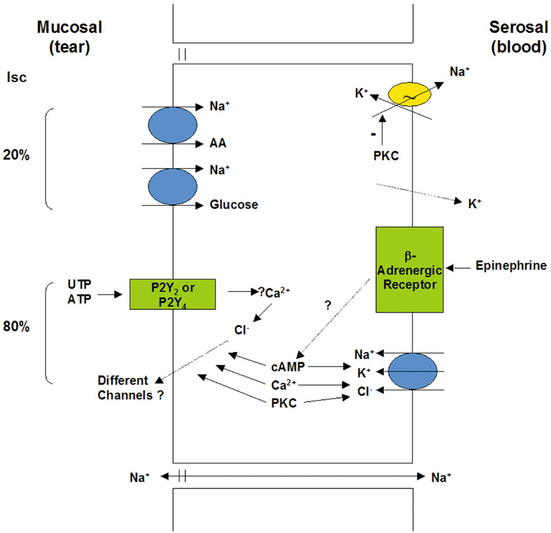 as secreting electrolytes and water. The movement of two ions (Cl−and Na+) drives conjunctival epithelial fluid transport (Fig. 8). Under short-circuit conditions, Cl−secretion (in a basolateral to apical movement) accounts for