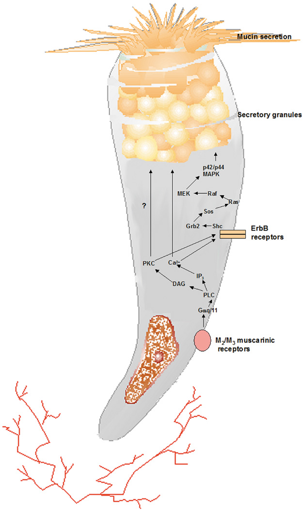 FUNCTIONAL ANATOMY OF GOBLET CELLS Goblet cells are highly polarized cells that provide for the unidirectional synthesis and secretion of mucins. These cells occur throughout the conjunctiva either singly or in clusters, depending on the species. Mucins are synthesized in the endoplasmic reticulum, modified in the Golgi apparatus, and stored in secretory granules in the apical portion of the cell. Upon the appropriate stimulus, the secretory granule membrane fuses with other secretory granule membranes and the apical membrane of the cell to release the stored mucin (Fig. 9). Entire populations of granules in the stimulated cell are released at once by a mechanism known as apocrine secretion. The goblet cell body then resynthesizes the mucins to secrete again. Several techniques have been used to identify goblet cells by staining the secretory proteins in the granules. However, this means that once a goblet cell has secreted, the stains can no longer identify it. Thus, these types of techniques tend to underestimate the number of goblet cells in a given sample. REGULATION OF CONJUNCTIVAL GOBLET CELL SECRETION Early studies suggested that the goblet cells are not innervated,26 despite the presence of sensory, sympathetic, and parasympathetic nerves in the conjunctiva. However, when the activation of nerves was prevented so that goblet cell secretion would not occur, nerves were identified surrounding conjunctival goblet cells in rats, mice, and humans.49,64,65 Parasympathetic and sympathetic (but not sensory) nerves were detected surrounding conjunctival goblet cells. Activation of these nerves can stimulate conjunctival goblet cell secretion, because a strong sensory stimulus to the cornea caused goblet cell secretion in the conjunctiva that was blocked by local anesthetic.66 This implies that activation of afferent sensory nerves stimulates efferent parasympathetic or sympathetic nerves to stimulate secretion of the goblet cells. This hypothesis is supported by the fact that three different types of neurotransmitter receptors have been localized on goblet cells. These receptors include three subtypes of muscarinic receptors (m1, m2, and m3) that are activated by the parasympathetic neurotransmitter acetylcholine, the vasoactive intestinal polypeptide (VIP)2 receptor that is activated by the parasympathetic neurotransmitter VIP, one subtype of the α-adrenergic receptor on human goblet cells that is activated by the sympathetic neurotransmitter norepinephrine, and three subtypes of β-adrenergic receptors (β1 and β2-adrenergic receptors in mice and rats, and β3-adrenergic receptor in humans) that are also activated by norepinephrine.49,65 Thus, nerves surround the goblet cells and stimulate them to secrete, and neurotransmitter receptors are present on goblet cells. To date, two neurotransmitters have been shown to stimulate conjunctival goblet cell secretion. These neurotransmitters are the parasympathetic neurotransmitters ACh and VIP.67–69 In contrast, activators of the α- and β-adrenergic receptors and Substance P do not stimulate goblet cell secretion. Thus, the parasympathetic nerves appear to be a major neural stimulus of conjunctival goblet cell secretion. The purinergic agonists UTP and ATP have been shown to stimulate goblet cell secretion.70 By determining the potency of a series of nucleotides, Jumblatt and Jumblatt70 implicated the P2Y2 receptors in the stimulation of goblet cell secretion. The source of these agonists in the conjunctiva is unknown, but they may be released from nerve endings, platelets, or damaged cells. SIGNALING PATHWAYS THAT REGULATE CONJUNCTIVAL GOBLET CELL SECRETION The signaling pathway that is activated by the cholinergic agonists (which are released from parasympathetic nerves) to stimulate goblet cell secretion has been characterized (Fig. 10). However, the pathway that is activated by another parasympathetic neurotransmitter, VIP, has not. Increasing the intracellular Ca+ with the use of a Ca2+ ionophore (ionomycin) or the cholinergic agonist carbachol stimulates goblet cell secretion.69,71 Activation of PKC by phorbol esters also produces goblet cell secretion; however, a direct role for PKC in cholinergic agonist stimulation has not yet been determined, because the PKC inhibitors themselves stimulate goblet cell secretion.71