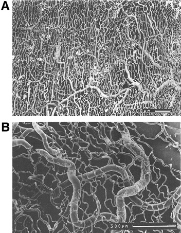 Approximately 2 mm from the eyelid on the tarsal conjunctiva lies a shallow (less than 1 mm deep) groove called the subtarsal groove. This groove runs parallel to the eyelid margin for most of the length of the tarsal conjunctiva. The groove marks the area of transition from the nonkeratinized, stratified squamous epithelium of the eyelid margin to the cuboidal epithelium of the tarsal conjunctiva (Fig. 3). The groove provides an ideal anatomical trap for small foreign objects before they can reach the cornea and bulbar conjunctiva. The objects trapped in the subtarsal groove are almost immediately covered with a thick coating of mucus and are moved medially by the blink to be carried out on, and trapped by, the hairs of the caruncle. There are multiple smaller ridges and grooves between the eyelid margin and the tarsal groove that contain a series of small saccular mucus glands. Each of these glands has a tubular lumen 15 to 30 μm in diameter that opens onto the conjunctival surface. These glands are formed by an invagination of the conjunctival epithelium and are lined with mucus-secreting epithelial cells.6 The nasal tarsal conjunctiva contains numerous structures known as Henle's mucus crypts. These crypts change in the midtarsal conjunctiva to form a network of subepithelial grooves. The grooves become tunnels with multiple interconnections that have small openings onto the ocular surface. The grooves and tunnels divide the surface of the conjunctiva into irregular papillae averaging approximately 100 μm in diameter (Fig. 5). At the orbital margin of the tarsus, the tunnel system opens onto the surface to form a network of grooves that divide the surface into bulges averaging 300 μm in diameter. In the fornix, these grooves and clefts are called Stieda's cleft and plateau system. These structures are generally larger and more prominent on the temporal side,7 and are usually more prominent in the upper eyelid than in the lower fornix. The patterns made by these clefts and grooves differ greatly between the conjunctivas of different individuals, as well as between the eyes of one individual. Local or systemic disease processes may result in hypertrophy of the underlying lymphoid layer, with follicle formation and profound alterations in the surface features of the conjunctiva. The conjunctival papillae that are normally present may also hypertrophy in response to infectious or toxic agents, and thus further modify the surface topography.7 This complex groove, crypt, and gland system covering the tarsal and forniceal conjunctivas provides an efficient trap system whereby small foreign bodies, bacteria, and cellular debris are sequestered, coated with mucus, and neutralized. These conjunctival surface folds greatly increase the total surface area and at the same time decrease the area of contact between the bulbar and palpebral conjunctiva, thereby reducing friction force as the two surfaces glide over one another during blinking and rotation of the globe. The bulbar conjunctiva is smoother than the palpebral conjunctiva and its surface features are less consistent. There are often four to six low broad papillae about the corneoscleral limbus that range in size from barely visible irregularities to the hypertrophic follicles that are occasionally seen in vernal conjunctivitis. The palisades of Vogt are structures around the limbus that radiate outward from the cornea. These structures consist of a series of 1.5- to 2-mm ridges and are formed by the epithelial rete ridges and the underlying stromal condensations. One of their functions is to trap small foreign objects that were on the cornea and were subsequently dislocated by blinking. Often the palisades are outlined by a fine brown line that radiates from the cornea. This is caused by the production of pigment from an increase in the local melanocyte population, which makes these structures easy to identify. The basal conjunctival epithelial cells are attached by desmosomes to a basement membrane. The tarsal conjunctiva is firmly attached to the tarsi and requires careful dissection. The upper tarsus is usually more tightly adhered than the lower tarsus. Meibomian glands are visible in both the upper and lower eyelids as yellow streaks running perpendicular to the eyelid margin. The conjunctiva of the fornix forms an almost continuous sac that is interrupted medially by the plica semilunaris. From the fornices the conjunctiva sweeps posteriorly to attach to and cover the eyeball, approximately 10 mm posterior to the limbus superiorly, 12 to 14 mm posterior to the limbus laterally, and 8 to 10 mm from the limbus inferiorly. Medially it variably covers the globe for approximately 7 mm posterior to the limbus. Four fornices are formed by the conjunctiva where it is reflected from the eyelids to the globe. The superior fornix is the largest in both size and volume. It is formed and maintained by fine smooth muscle slips that pass from the levator palpebral superioris muscle and insert into the conjunctiva. This attachment prevents the conjunctiva from folding downward over the cornea. It also prevents the fornix from developing sags as the globe moves upward, which might obstruct vision. The temporal fornix is attached by fine fibrous slips to the tendon of the lateral rectus muscle, again maintaining the relative position of the fornix during horizontal movements of the globe. The inferior fornix is attached to the tendon of the inferior rectus, which prevents its movement. The plica semilunaris performs the same function as a fornix medially, and is a reversed fornix with the fold of conjunctiva lying externally (Fig. 3). During a medial gaze, the fornix has a variable depth. This occurs because the fibrous slips that link the conjunctiva to the tendon of the medial rectus muscle insert onto the deep surface of the plica and caruncle. Contraction of the medial rectus tightens these slips, forming a cul-de-sac medially as the globe ad