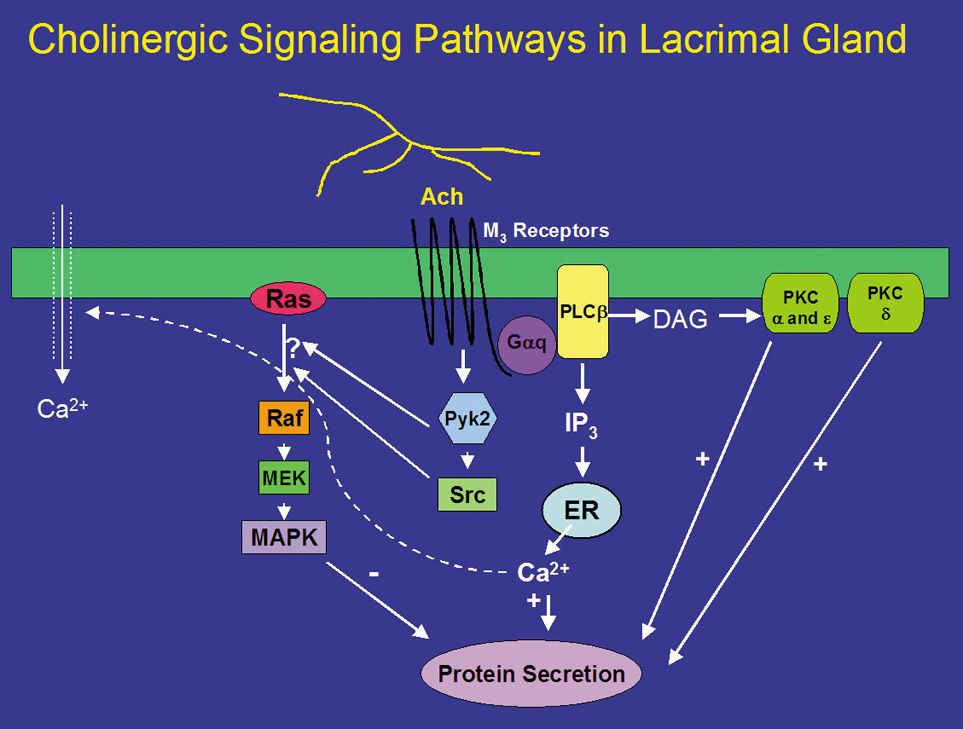 LACRIMAL GLAND AND ACCESSORY GLANDS The exocrine main lacrimal gland is located in the superotemporal orbit in a shallow lacrimal fossa of the frontal bone. It is surrounded by fibrous tissue that is attached superiorly to the frontal bone periosteum. In the adult, the lacrimal gland measures 20 mm by 12 mm by 5 mm and weighs approximately 0.78 g. It is incompletely divided by the lateral horn of the levator aponeurosis into a larger orbital lobe, which comprises 60% to 70% of its total mass, and a smaller palpebral lobe below.1,2 The two lobes are connected by vessels, nerves, and the lacrimal ducts. The orbital lobe lies posterior to the orbital septum and preaponeurotic fat, and anterior to the levator aponeurosis.1 With increasing age, the gland may herniate through a weakened orbital septum, resulting in fullness of the lateral upper eyelid. The palpebral lobe is located posterior to the levator aponeurosis in the subaponeurotic space and directly anterior to the conjunctiva, which is adherent to the posterior aspect of the gland. Medially, Müller's muscle may intervene between the posterior gland and the conjunctiva. Anteriorly, the palpebral lobe may extend beyond the orbital margin to lie in the superolateral fornix, where it may be visible through the conjunctiva with eyelid eversion. The lacrimal gland is divided into numerous lobules, separated by interlobular fibrovascular connective tissue. Each lobule is structurally composed of the acinar unit and the ductal system. Two to six secretory ducts from the orbital lobe of the lacrimal gland pass through the palpebral lobe or along its fibrous capsule, joining with ducts from the palpebral lobe to form 6 to 12 tubules that empty into the superolateral conjunctival fornix 4 to 5 mm above the tarsus.3,4 Excision of the palpebral lobe may therefore interrupt drainage from the orbital lobe. The ducts, lined by pseudostratified, nonkeratinizing squamous epithelium, form a branching pattern within the lacrimal gland. Secretion from the acinar units first drains into the smaller intralobular ducts, proceeds through the larger interlobular ducts, and eventually passes into the main excretory ducts before draining into the superolateral conjunctival fornix. The surface of the ductal lumina contains microvilli, similar to the acinar secretory cells.5,6 The epithelial walls of the larger ducts contain three to four layers of columnar or cuboidal cells, compared with a single layer in the smaller intralobular ducts. Each acinar unit, or secretory unit, of the lacrimal gland is composed of an inner layer of columnar or pyramidal-shaped secretory cells around a central lumen, and a surrounding basal layer of myoepithelial cells. The nucleus is located at the base of the acinar secretory cell, and numerous membrane-bound zymogenic secretory granules are present in the apical cytoplasm.7 The number and size of granules, which contain predominantly serous proteins for secretion, vary from cell to cell. Typically, larger granules are located in the peripheral lobules.6,8 The zymogenic secretory granules fuse with the apical cell membrane and release their granular contents into the acinar lumen through a mechanism known as emiocytosis.5,6,9 Myoepithelial cells are spindle- or basket-shaped cells, composed of cytoplasmic myofilaments, located between the base of the secretory cell and the basement membrane of the acinar unit.7 Contraction of the myoepithelial cells helps drive secretions into the drainage tubules and ducts. Accessory lacrimal glands are located in the conjunctival fornices and along the superior tarsal border. There are approximately 20 to 40 accessory glands of Krause in the superior conjunctival fornix. There are approximately half the number of glands of Krause present in the lower eyelid as in the superior conjunctiva. Accessory glands of Wolfring, which are slightly larger, are located along the superior tarsal border in the upper eyelid, with 4 to 20 located in the upper eyelid, and 2 to 4 in the lower eyelid.1,3,10,11 The accessory lacrimal gland lobules empty onto the conjunctiva surface through small branching ducts that drain into a single excretory duct that is lined by one or two layers of cells.11 Like the main lacrimal gland, the accessory lacrimal glands are also innervated. Parasympathetic and sympathetic nerves have been identified in accessory lacrimal glands of humans.11–14 The presence of nerves suggests that secretion from accessory lacrimal glands is neurally regulated. Therefore, the accessory lacrimal glands can also contribute to stimulated tear secretion. INNERVATION OF THE SECRETORY SYSTEM The lacrimal gland receives innervation from cranial nerves V and VII, as well as from the sympathetics of the superior cervical ganglion.15 The lacrimal branch of the ophthalmic division of the trigeminal nerve carries sensory stimuli from the lacrimal gland, with the cell bodies located within the Gasserian ganglion. Afferent sensory fibers exit the posterior aspect of the lacrimal gland, travel along the superior border of the lateral rectus muscle, and exit the orbit through the superior orbital fissure. Parasympathetic secretomotor fibers originate in the lacrimal nucleus of the caudal pons and exit the pontomedullary junction between cranial nerves VI and VIII. The fibers enter the internal auditory canal and travel a long course within the nervus intermedius, the greater superficial petrosal nerve, the deep petrosal nerve, and the vidian nerve to finally synapse in the pterygopalatine ganglion.4 The greater superficial petrosal nerve arises from the preganglionic parasympathetic fibers of the geniculate ganglion. The deep petrosal nerve carries sympathetic fibers from the internal carotid plexus. Postganglionic parasympathetic fibers leave the pterygopalatine ganglion through the pterygopalatine nerves to innervate the lacrimal gland.16,17 Some fibers may join the zygomatic nerve as it branches from the maxil