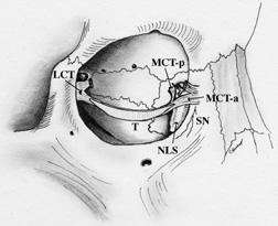 The nasolacrimal duct, measuring 3 to 4 mm in diameter, travels inferolaterally and slightly posteriorly in its bony course to the inferior turbinate for an interosseous distance of 12 mm (Fig. 9). The anterior, lateral, and posterior walls of the canal are formed by the maxillary bone, and the medial wall is formed by the lateral nasal wall and descending process of the lacrimal bone.100 The long axis of the duct and canal forms an angle of 15 to 25 degrees posterior to the frontal plane, or in a line connecting the medial commissure to the first molar tooth.87 The nasolacrimal duct terminates as a 5-mm extension into the inferior nasal meatus on the lateral wall or roof of the inferior meatus. The ostium is located, on average, 25 to 30 mm posterior to the lateral margin of the anterior nares, or 20 mm in children.87,101 When the nasolacrimal duct ostium is obstructed, the duct and sac distend with accumulated fluid. Distention of the intraosseous duct is limited to a diameter of 4 mm because of the rigid bony walls of the canal, with necessary compression of the lymphatic and venous plexi surrounding the duct. The lacrimal sac, in contrast, is not restricted by bone, and may expand laterally and anteriorly. Distention of the sac initially occurs inferiorly, because the medial canthal tendon surrounds the superior half of the sac. The lacrimal drainage system histology transitions from a nonkeratinizing stratified squamous epithelium in the puncta and canaliculi to a dual columnar layer epithelium in the nasolacrimal sac. As the duct approaches the nasal cavity, it gradually shifts to mucoperiosteum with scattered mucus-secreting goblet cells.87 Multiple mucosal folds and sinuses have been reported within the lacrimal drainage system, and they may play a role in regulating tear drainage. The previously mentioned valve of Rosenmüller is located at the junction of the common canaliculus and sac, and the valve of Krause is located between the sac and duct. A mucosal flap, Hasner's valve (or plica lacrimalis), may be present at the opening of the duct into the inferior meatus of the nose.102 VASCULAR SUPPLY AND INNERVATION TO THE EXCRETORY SYSTEM The vascular supply to the nasolacrimal drainage system is composed of contributions from the ophthalmic artery, angular artery, infraorbital artery, and internal maxillary artery. The ophthalmic artery courses anteromedially within the orbit after passing over the optic nerve to become the dorsal nasal artery. The dorsal nasal artery gives rise to the superior medial palpebral arteries that supply the lacrimal sac. The facial artery crosses the mandible diagonally and runs along the line of the nasojugal skinfold to become the angular artery. The angular artery passes deep to the orbicularis oculi muscle and superficial to the medial canthal tendon, with the angular vein immediately lateral to the artery (Fig. 10). Both vessels are located approximately 5 mm anteromedial to the anterior lacrimal crest, or 8 mm medial to the medial commissure of the eyelids.87 The angular artery then perforates the orbital septum above the medial canthal tendon to supply branches to the nasolacrimal sac and duct. The infraorbital artery mainly supplies the inferior sac and upper nasolacrimal duct. The inferior nasolacrimal duct receives its arterial supply from the nasal branch of the sphenopalatine artery, a branch of the internal maxillary artery.87,103 On the frontal process of the maxilla just anterior to the lacrimal sac fossa, a fine groove termed the sutura notha or sutura longitudinalis imperfecta of Weber, runs parallel to the anterior lacrimal crest (Fig. 8).87,96 Small twigs of the infraorbital artery pass through this vascular groove to supply the bone and nasal mucosa.