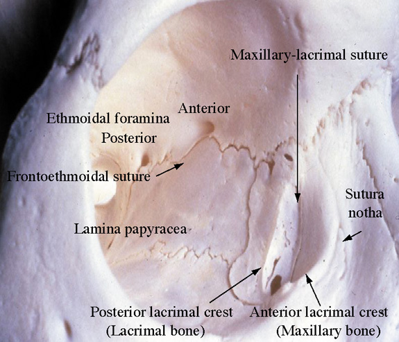 The superior and inferior canaliculi merge to form a common canaliculus before entry into the nasolacrimal sac in more than 90% of individuals.3,92 In a study using digital subtraction dacryocystograms, the common canaliculus was present in 94% of lacrimal drainage systems. The upper and lower canaliculi join at the lacrimal sac wall without a common canaliculus in an additional 4%, with only 2% of systems having completely separate drainage of the upper and lower canaliculi into the lacrimal sac.93 The opening of the common canaliculus into the lacrimal sac is known as the common internal punctum, which should be free of any mucosal membrane or stricture for success of dacryocystorhinostomy surgery. The functional valve between the common canaliculus and the lacrimal sac has traditionally been attributed to the valve of Rosenmüller, although some studies have been unable to document this structure.94 Tucker demonstrated that the canaliculi consistently angle posteriorly en route to the lacrimal sac.95 The canaliculi then bend at the canaliculus-common canaliculus junction at an angle of 118 degrees, before passing anteriorly to enter the lacrimal sac at an acute angle of 58 degrees. This consistent angulation may contribute to a valve-like effect that prevents retrograde flow of tears from the lacrimal sac. The nasolacrimal sac and duct are portions of the same continuous structure. The lacrimal sac is lined by nonciliated columnar epithelium. The total sac measures 12 to 15 mm vertically and 4 to 8 mm anteroposteriorly, although it may be slightly larger in males.91 The fundus of the sac extends 3 to 5 mm above the medial canthal tendon, and the body of the sac measures 10 mm in height (Fig. 6).3 The lacrimal sac is ensheathed in the lacrimal fascia, which refers to the periorbital lining that splits at the posterior lacrimal crest into one layer that lines the fossa, and another layer that encases the lateral sac to reach the anterior lacrimal crest. Between the lacrimal fascia and the lacrimal sac there is a narrow space that contains a fine venous plexus draining into the angular or supraorbital vein.96 In addition, the lacrimal sac is wrapped by the thick anterior and thin posterior limbs of the medial canthal tendon. The structure of the medial canthal tendon has been described as having superior and inferior crura that arise from the tarsal plates. The crura combine to form the medial canthal tendon that then divides into a thicker anterior limb that wraps along the anterior upper half of the lacrimal sac before inserting onto the anterior lacrimal crest, and a very thin posterior limb that passes behind the sac to insert onto the posterior lacrimal crest (Fig. 7). The posterior limb helps maintain the position of the medial canthus in instances of traumatic or surgical disinsertion of the anterior limb. Anatomic dissections have also demonstrated a superior supporting branch of the tendon that courses superiorly to insert onto the frontal bone periosteum at the superomedial orbital rim.97 Below the anterior limb, the inferior portion of the lacrimal sac is bound anteriorly only by the orbital septum, which also inserts onto the anterior lacrimal crest. A distended sac may herniate initially through this thinner inferior septal lining. The sac rests in the lacrimal sac fossa, with its medial aspect tightly adherent to the periosteal lining of the fossa. The lacrimal sac fossa is a depression in the inferomedial orbital rim, formed by the maxillary and lacrimal bones. It is bordered by the anterior lacrimal crest of the maxillary bone, and the posterior lacrimal crest of the lacrimal bone (Fig. 8). The fossa is approximately 16 mm high, 4 to 9 mm wide, and 2 mm deep.87,98 The fossa is widest at its base, where it is confluent with the opening of the nasolacrimal canal. The lower nasolacrimal fossa and the nasolacrimal duct are narrower in females, which may account for the female predominance of nasolacrimal obstruction.99