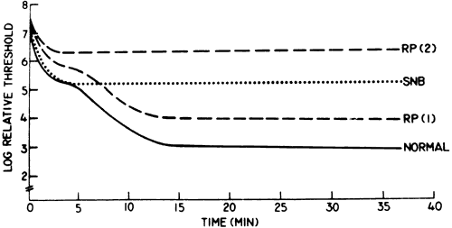 starlight or moonlight conditions.4 Figure 2 also illustrates dark adaptation curves from two representative patients with retinitis pigmentosa (RP); they show impairment of the initial cone limb of dark adaptation and, in the case of RP-2, no cone-rod break. Both patients RP-1 and RP-2 have night blindness under dim photopic conditions because they have impairment of their cone thresholds. Stated in another way, patients RP-1 and RP-2 report “night blindness” primarily because of impaired cone function.4 Some patients with early macular degeneration also have difficulty seeing at night, but on further questioning they report that this symptom occurs when driving at night and trying to adjust after looking at oncoming headlights; these patients appear to be experiencing difficulty with the capacity of their macular cones to dark adapt. |