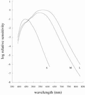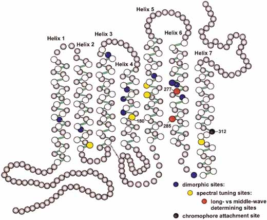 VARIATIONS IN X-LINKED PIGMENTS IN COLOR-NORMAL OBSERVERS The genes that code for L and M cone photopigments are on the X-chromosome. There are variations in the number of L and M pigment genes in color normals, with the most common arrangement being a single L pigment gene followed by two M pigment genes.93 Furthermore, there are variations among L and M genes of color normals. Each gene codes for an opsin molecule, which is a long strand of 364 amino acids. The opsin is embedded in the cone membrane lipid bilayer, and it is folded such that the membrane is crossed seven times. The L and M nucleotide sequences have 98% identity. The chromophore, 11 cis-retinal, is attached at amino acid (Lysine) site 312, and it is weakly bound to other amino acid sites by side chains. It is the bonding relationship between the opsin and the chromophore that provides the spectral tuning of a pigment. There are 18 dimorphic sites in the amino acid sequence of X-linked pigments.94 These are shown in Fig. 26. A limited subset of these 18 sites is responsible for spectral peak location. Of the 18 dimorphic sites, two are particularly critical as the amino acids here determine whether a pigment is considered to be L or M. At positions 277 and 285, the respective presence of phenylalanine and alanine produces an M pigment whereas tyrosine and threonine produce an L pigment. The spectral separation (wavelength of peak absorption) produced by this dimorphism is approximately 20 nm.94 Dimorphic changes at five other locations produce smaller shifts in the wavelength of peak absorption. Changes at other sites may play a role in variations in normal color vision. In particular along the L pigment gene, position 180 appears important in determining color matching behavior.95 Careful measurements of the Rayleigh match in color normal men shows that the match midpoints are somewhat bimodally distributed,96 and that the distribution to which an individual belongs is determined largely by the specific amino acid (serine or alanine) at position 180 along the L opsin. Thus the L opsin contributes strongly to color vision variations among color normal males. The distribution of match midpoints for color normal females is broad, it is unimodal and it is centered on the male midpoint. This is expected if females express on average half their L pigments with alanine at180 and half with serine at 180. The important consequence, of course, is that a color normal retina that expresses two types of L pigment contains four cone pigments (two L, one M, and one S), not the classically described three. Furthermore, Sjoberg et al 97 have shown that in color normal males, more than just the first two pigment genes along the X chromosome can be expressed. In their study, 8% of color normal males expressed multiple different L pigment genes, in addition to an M pigment. Clearly, some eyes have more than three cone pigments and yet trichromacy prevails. Thus trichromacy is unlikely to be determined solely by the number of photopigments. Variations in amino acid sequence among normal L and M pigments produce families of absorption curves with slightly different peak wavelengths. Fig. 27 shows a series of pigment absorption curves resulting from known amino acid sequences coded by L and M genes. This means that two color normal individuals might in fact have different M pigments and different L pigments.