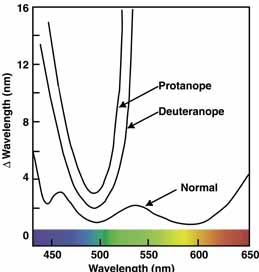 color defectives). HUE DISCRIMINATION There are two regions of the visible spectrum in which the ability to discriminate between adjacent wavelengths is at a maximum for normal eyes (Fig. 13). In these two regions, approximately 490 and 590 nm, there need be only a 1- or 2-nm difference between wavelengths for them to be seen as different! Wavelength discrimination (hue discrimination) is less acute in the middle of the spectrum and deteriorates rapidly at the ends of the spectrum. These measurements typically are made by comparing two adjacent patches of essentially monochromatic light (usually half fields of a circular patch) in which the two colors are carefully equated in brightness so that brightness differences do not form the basis of the discrimination. As Wright has pointed out, the curve has the characteristics that might have been anticipated from looking at the spectrum (as was demonstrated at the beginning of the chapter).54 The part of the spectrum in which maximum wavelength discrimination occurs is where the colors appear to be changing most rapidly. In the yellow region (590 nm), there is a rapid change to red on one side and green on the other; in the blue–green region (490 nm), there is a rapid change to blue on one side and green on the other. To distinguish lights that differ only in wavelength, the ratio of each of the cone receptor outputs must be compared for the two lights. One might consequently expect this ratio to be changing most rapidly in the spectral region in which the spectral sensitivity functions intersect or are changing most rapidly with respect to each other. As expected, “cross-points” are close to the spectral regions where the best hue discrimination occurs. In color-vision defectives who lack a cone pigments and therefore lack one of the crossing points, there is the expected loss of hue discrimination in that spectral region. Typical hue discrimination curves for severe color defectives are also shown in Figure 13. Notice that dichromatic wavelength discrimination is considerably worse than for normals and only approaches the normal value in the normal's blue–green (490 to 500nm) region of the spectrum. The red–green dichromat (protanope and deuteranope) is essentially a monochromat for wavelengths greater than 530 nm, which results in greens, yellow, oranges, and reds being indistinguishable in many situations. The anomalous trichromat, whether protanomalous or deuteranomalous has a similar but less severe deficiency in wavelength discrimination ability in the same region of the spectrum. The anomalous trichromat may have wavelength discrimination close to that of the dichromat (extreme anomaly) or almost identical with that of the normal eye (simple anomaly). These facts could have been predicted from the presumed physiology of the color defectives. Protanopes and deuteranopes appear to lack one of the three cone pigments—L and M, respectively. Consequently, for wavelengths greater than approximately 530 nm, there is only one cone photopigment being stimulated, leaving the dichromat in a monochromatic state for that region of the spectrum. The remaining cone pigments provide a basis for hue discrimination for wavelengths shorter than 530 nm. Anomalous trichromats probably have two of their three photopigments with peak wavelength sensitivities close together on the spectrum.55 The extreme anomal, whose color vision is similar to that of a dichromat, has two photopigments for the medium- and long-wavelength spectral regions whose peak sensitivities differ only by a few nanometers. Consequently, this will result in large portions of the spectrum producing similar ratios of stimulation for the two photopigments with an accompanying loss of wavelength discrimination. Although less well studied, the hue discrimination with tritan defects fits the predictions based on the absence or displacement of the S (blue) photopigment; short wavelength discrimination is poor, and the best wavelength discrimination is found at approximately 570nm. LUMINOSITY The lightness or brightness of a color depends largely on the relative luminous efficiency of the component wavelengths. Under daylight or photopic light conditions, a given brightness response is produced with the least amount of incident energy in the middle of the visible spectrum. A number of experiments have shown that the normal eye has a peak luminosity function at approximately 555 nm and that luminosity falls off toward the ends of the spectrum. Under scotopic or rod-dominated light conditions, the most luminous-efficient wavelengths are closer to 507 nm. The wavelength shift of maximum luminosity from photopic to scotopic viewing is the so-called Purkinje shift. Figure 14 shows the relative luminous efficiency for these two conditions. The curves form the basis of light units (photometric and scotometric, respectively) that are used internationally. The spectral luminosity function for color defectives can be compared with that for normals (Fig. 14). Some color defectives who lack the L cone photopigment (protanopes) or have it displaced in the spectrum (protanomalous trichromats) have an abnormal spectral luminosity function and consequently perceive long wavelengths as very dim, compared with the way they are perceived by the normal eye. Many find difficulty in seeing deep-red lights in some light-emitting diode displays of hand-held electronic calculators or in seeing brake lights on automobiles during daytime driving. Cole and Brown have shown that protanopes, because of this intensity loss, have longer reaction times than normal to red traffic signals.56 These individuals find the international system of specifying light units inappropriate. Different colored lights (e.g., red and green) specified as being of equal luminance (eg, 10 cd/m2 each) will have very different brightness to their eye. All other color defectives appear to have essentially normal luminosity, although there