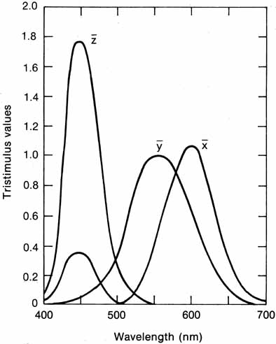 TRICHROMACY OF NORMAL VISION The fact that the normal human eye can match any color by the mixture of three other colors (none of which can be mixed to match the third “primary” color) is what leads to the conclusion that normal vision is trichromatic. James Clerk Maxwell in 1855 provided the first quantitative data on trichromacy. He used a spinning top to additively mix colors and determined the relative amounts of various primaries needed to match a reference white.5 It should be clear that trichromacy is an empirical finding and it implies that there are three fundamental variables or channels, the relative outputs of which determine our color matching behavior. It does not state that there are three cone pigments, although this is certainly an appealing and simple connection to make. Conceptually one will not go far wrong in making this connection. A more recent approach is to use a fixed set of primaries and to determine the relative amounts of each needed to perfectly match all visible wavelengths in turn. In 1931 a set of color mixing data was adopted by the CIE (Commission Internationale d'Eclairaige) as the Standard Colorimetric Observer with red, green, and blue color primaries (RGB) This was the first step in deriving an internationally recognized color system based on human visual performance. The CIE 1931 RGB system could be used to specify colors as seen by the human eye. The amounts of these three RGB primaries allowed specification of the color matches of the monochromatic wavelengths across the spectrum assigning them “tristimulus values.” In specifying any colors the relative amounts of these primaries (r, g) required to match a color can be used to generate a two-dimensional chromaticity plot. In the RGB system of colorimetry, some colors have a negative chromaticity coordinate. This tends to occur when attempting to make a match to many blue–green lights. However, conversion of one set of primaries to another is simply matrix algebra and there are solutions in which the color matching functions are all positive. In these cases, the primaries lie outside the spectral locus, which means that they are unrealizable or imaginary primaries. This has been performed by the international community with the CIE 1931 XYZ system. It has no negative numbers. The XYZ system has one further feature. The spectral shape of the tristimulus values of the Y primary, for the equal energy monochromatic spectrum, was chosen to match the CIE 1924 luminosity curve. Consequently, two samples with same Y tristimulus values are defined as having equal luminance, regardless of their Z and X values. This means that luminance can be derived by calculating the total amount of Y primary in the XYZ mixture required to match the color that is being specified. Again, the amounts of each of these three XYZ primaries needed for color matches of the individual monochromatic wavelengths across the spectrum allows specification of their “tristimulus values” (Fig. 17).