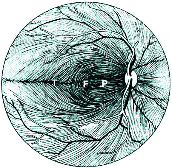 RETINAL GANGLION CELL AXONS WITHIN THE NERVE FIBER LAYER The optic nerve begins with the retinal ganglion cell, which is located in the innermost layer of the retina, within in the ganglion cell layer. Retinal ganglion cells receive input from bipolar cells and amacrine cells and project their axon toward the vitreous; then the axon makes an approximately 90° turn and projects toward the optic nerve head in the nerve fiber layer (Fig. 1). The fibers in the temporal part of the retina (corresponding to the nasal visual field) course away from the fovea, and then once in the nasal retina the fibers turn back toward the optic disc, entering in the superior and inferior portions of the disc. The retinal ganglion cell axons arising from retinal ganglion cells in the nasal retina project more directly to the disc, as follows: The fibers from the nasal half of the macula, forming the papillomacular bundle (or more properly, the maculopapillary bundle), enter at the temporal disc, whereas the fibers arising from ganglion cells nasal to the disc enter at the nasal part of the disc. In addition, there is strict segregation of those fibers arising from retinal ganglion cells located superior to the temporal horizontal meridian (temporal raphe) and those fibers arising from retinal ganglion cells located inferior to the temporal raphe. Because of this segregation, visual field defects corresponding to the injury to the retinal ganglion cell axons typically have stereotyped patterns (e.g., superior or inferior nasal steps, temporal wedges, or the arcuate scotomas). These are called nerve fiber bundle defects and are covered at length in the chapters on glaucoma. Once at the optic disc, the ganglion cell axons take a 90° turn away from the vitreous toward the brain (Fig. 2). This marks the beginning of the optic nerve, which is depicted in Figure 3. The neuroretinal rim of the disc is the part of the disc that corresponds to the projection of the nerve fibers into the optic nerve. The cup is the part of the disc that does not contain retinal ganglion cell axons. Depending on the size of the disc and whether there is any developmental or acquired injury, the cup-to-disc ratio may range from 0 to 1.0; the former represents a congenitally full disc, and the latter represents a disc that is completely “cupped out,” most commonly as a result of glaucomatous optic neuropathy. INTRAORBITAL OPTIC NERVE Although the retinal ganglion cell axon begins in the inner retina and continues along the nerve fiber layer of the retina, the optic nerve is considered to begin at the optic nerve head. There is an approximately 1-mm component of optic nerve within the intrascleral part of the globe and approximately a 30-mm length of optic nerve from the globe to the optic canal.1 The straight-line distance from the back of the globe to the optic canal is much less (the exact amount depending on individual orbital depth); the relative excess optic nerve is necessary for free movement of the globe during eye movements. In some cases excessive proptosis can exhaust the surplus length of optic nerve, resulting in tethering of the globe by the nerve. The retinotopic (topographic correspondence of optic nerve fibers to retinal location) segregation of retinal ganglion cell axons, particularly the segregation between axons arising from the superior retina and inferior retina, is gradually lost as the axons enter the nerve. There is only moderate retinotopy in the initial segment of the optic nerve.2 The retinotopy decreases distally3,4 and then becomes ordered for eventual nasal decussation near the chiasm.5 Within the orbit, the optic nerve travels within the muscle cone formed by the superior rectus, lateral rectus, inferior rectus, and medial rectus muscles. Tumors within the cone are common sources of compression of the optic nerve, or compressive optic neuropathy. Examples of these tumors include cavernous hemangioma, hemangiopericytoma, fibrous histiocytoma, lymphoma, and schwannoma. In addition, enlargement of the muscles themselves, particularly the inferior rectus and/or the medial rectus in Grave's (dysthyroid) ophthalmopathy, may also compress the optic nerve. THE OPTIC CANAL The optic nerve enters the cranium via the optic canal, a 5- to 12-mm passage that lies immediately superonasal to the superior orbital fissure. The optic canal contains some axons of sympathetic neurons destined for the orbit, as well as the ophthalmic artery. The latter lies immediately inferolateral to the optic nerve and is covered in dura. At the distal end of the canal, there is a half-moon-shaped segment of dura that overhangs the optic nerve superiorly and, thereby, lengthens the canal by a few millimeters. Within the canal, and immediately posterior to the optic canal, meningeal tissue is adjacent to the optic nerve. Benign tumors of the meninges, or meningiomas, are frequent causes of compressive optic neuropathies in these locations. Small tumors within the canal itself, where there is very little free space, may lead to compressive optic neuropathy without a radiographically visible tumor. INTRACRANIAL OPTIC NERVE AND THE CHIASM Once the nerve has entered the cranium, there is a highly variable (3 to 18 mm) length of nerve until the chiasm is reached. The length of the chiasm is approximately 8 mm. The intracranial optic nerve and chiasm are immediately above the planum sphenoidale and sella turcica (which contains the pituitary gland). There is approximately 10 mm between the inferior part of the nerve and the superior part of the pituitary. Tumors of the pituitary that are large enough to compress the chiasm may, therefore, cause compressive optic neuropathy. The nature of the retinotopic segregation changes as the fibers approach the chiasm; the temporal fibers are destined to remain ipsilateral, whereas nasal fibers cross. The ratio of fibers that cross to those that do not cross is approximately 52:48.6 This small difference 