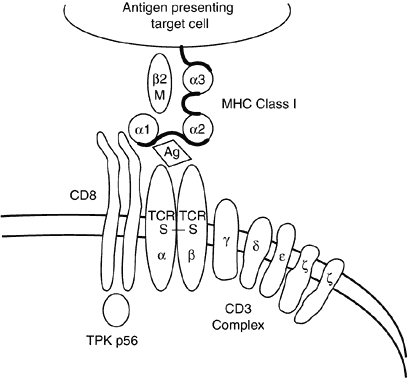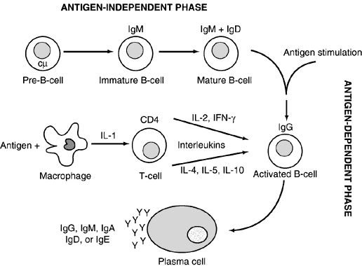 disease later in this chapter. PHYSIOCHEMICAL BARRIERS Physiochemical barriers are significant first-line elements of a host's defense. The skin and mucous membranes limit access to the host by invading microorganisms. Enzymes, such as lysozyme, nonspecifically inhibit microbial growth. In the eye, the conjunctiva and the tear fluid layer provide the primary barrier against environmental aeroallergens, chemicals, and infectious agents. The tear fluid layer contains both specific and nonspecific immunologically active proteins, including lysozyme, histamine, tryptase, lactoferrin, ceruloplasmin, vitronectin, immunoglobulin A (IgA), immunoglobulin G (IgG), immunoglobulin M (IgM), and immunoglobulin E (IgE).4 Lymphocytes Lymphocytes are the cells responsible for the specificity of immune recognition and for coordination of the immune response. They are derived from a lymphoid progenitor cell in the bone marrow and are divided into three classes: T cells (lymphocytes), B cells (lymphocytes), and natural killer (NK) cells. T cells and B cells are morphologically indistinguishable, small 8- to 10-μm-in-diameter lymphocytes with large nuclei. They are functionally distinct and are easily differentiated by the cell surface proteins they express: T cells with CD3, CD4, and CD8 and B cells with CD-19 surface markers.1 NK cells are large lymphocytes with many cytoplasmic granules, distinct cell surface markers (CD16), and the ability to lyse cells directly, especially tumor cells or normal cells infected by virus. NK cells lack immunoglobulin or TCRs for antigen recognition yet do not kill their targets at random. Their means for target cell recognition is not well understood. NK cells do participate in antibody-dependent cellular cytotoxicity (ADCC) on the basis of their expression of a low-affinity receptor for the Fc portion of IgG (CD16). In ADCC, a target cell coated with IgG can be lysed directly by an NK cell after binding of the Fc portion of IgG with its low-affinity receptor CD16. This not only provides a means of recognition for the target by the NK cell but also serves to activate it to release its granule contents such as perforin, an enzyme that perforates the wall of the target cell, and secrete cytokines to augment the inflammatory response.1 B cells develop from their precursors in the fetal liver and adult bone marrow. (They were first shown to mature in birds in the bursa of Fabricius, hence “B” cell.) They are primarily responsible for humoral immunity and are the exclusive producers of immunoglobulins, also known as antibodies, thus playing a vital role in the recognition and elimination of foreign antigen (further discussion on immunoglobulins below). Mature B cells can be divided into memory cells for the development of a rapid secondary response and plasma cells, which are totally committed to produce a single protein, an immunoglobulin. Plasma cells are terminally differentiated producers of large amounts of antibody (Fig. 2). B cells also interact closely with helper T cells through cell surface proteins such as CD40 and class II MHC and their complementary ligands. T cells develop from their bone marrow precursors in the thymus, where somatic gene rearrangement gives rise to functional TCR complexes as well as distinctive cell surface proteins. T cells can be functionally subdivided into either helper or cytolytic (CTL) cells. These functionally different populations express distinct cell surface proteins: CD4 on helper cells and CD8 on CTLs, which serve as ligands for the MHC gene products on antigen-presenting cells.5 CD4+ cells play a vital role in B-cell growth and differentiation, including the production of antibodies.6 They also are crucial in macrophage activation and in upregulating or downregulating the immune response. CD4+ cells can be further subdivided into TH1 and TH2 lymphocyte populations based on their cytokine-producing properties. Cytokines are small proteins produced by cells in response to a variety of inducing stimuli. Cytokines are produced by their producer cells and then influence the behavior on target cells. Hormones are classical polypeptides that also fulfill this definition but are not by convention classified as cytokines since they are produced by specific endocrine organs (e.g., the thyroid gland), whereas a cytokine may be produced by more than one cell type in a number of different tissues. Cytokines similar to hormones act on the cells that produce them (autocrine), on cells in a distant organ (endocrine), or on cells in the immediate vicinity of their production (paracrine) fashion to regulate lymphocytes, antigen-presenting cells, other inflammatory cells, and immunologically active molecules involved in cellular communication. Multiple studies have shown that cytokines also are characterized by their ability to act on different cells (pleiotropism), produce different effects on the same target cell, share properties with other cytokines (redundancy), and influence the production of other cytokines.1 It also has been discovered that among their many functions, cytokines can affect cell growth and differentiation similarly to those of the growth factors. Given the enormous diversity of cells producing cytokines and the numerous effects (many of which still are unknown) exerted by these molecules, it has been difficult to develop a satisfactory classification (Table 1). Cytokines also may be classified by cell of origin, but it is now clear that certain cytokines are produced by many cells, making these criteria impractical for classification.