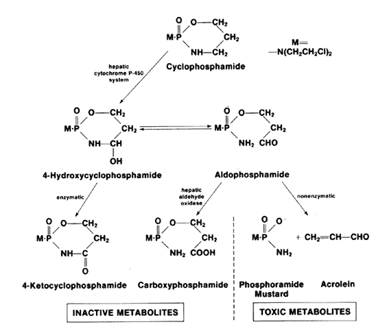Nitrogen mustards are chemically unstable compounds, and structural modifications were required to make them clinically practical. One structural modification allowed the aromatic derivative of mustard gas (mechlorethamine), chlorambucil. This alteration yields the agent relatively inert, permitting oral administration. Chlorambucil is metabolized in rats to the alkylating agent, phenyl acetic mustard(s),11 and a ß-oxidation of chlorambucil has been reported in humans.12 The replacement of the N-methyl moiety with a cyclic phosphamide group (see Fig. 1) yields cyclophosphamide.13 For cyclophosphamide to be therapeutically active, it must be metabolized by the liver's microsomal system.14,15 It was initially hoped that neoplastic lesions high in phosphamidases and phosphatases would selectively metabolize cyclophosphamide; unfortunately, this does not appear to be true. Cyclophosphamide is metabolized into several compounds (Fig. 2), and phosphoramide mustard is thought to be the most active alkylating agent.16 Other metabolites, such as 4-hydroxycyclophosphamide, although less cytotoxic, may enter cells more readily and could play an equally important role.10 EFFECTS ON THE IMMUNE SYSTEM Most alkylating agents appear to be cell-cycle nonspecific, except for cyclophosphamide, which appears to be especially effective at the S-phase of the cell cycle. Acutely, the administration of high doses of cyclophosphamide seems to have a greater effect on B cells rather than T cells. However, at lower, chronic doses of cyclophosphamide, both B-cell and T-cell functioning are altered.17 Indeed, this agent can induce a selective depletion of thymus-dependent cortical areas of lymph nodes in mice18 and prolongs the survival of transplanted organs.19 Both chlorambucil and cyclophosphamide are capable of preventing experimental allergic encephalomyelitis,20,21 a T-cell-mediated experimental model. Interestingly, cyclophosphamide is able to induce tolerance in many mammals, including rats, against human blood cells.22 EFFECTS ON OCULAR INFLAMMATORY DISEASE Cyclophosphamide has been shown to suppress the inflammatory response in rabbits following intravitreal deposition of bovine γ-globulin.23 Systemically administered cyclophosphamide decreased the titer of antibody in the aqueous and vitreous, and the number of antibody secreting cells in the uveal tract and cornea, when compared with controls. It also alters the late phase of experimentally induced herpes simplex infections in rabbits, which appears to be mediated by immune rather than infectious processes.24 Alkylating agents have been used in the treatment of several ocular inflammatory conditions. Buckley and Gills25 reported that combined cyclophosphamide and steroid therapy was particularly effective in suppressing the inflammatory response in patients with intermediate uveitis, while decreasing the incidence of adverse effects secondary to high-dose chronic steroid therapy. They emphasized, however, that many foods contain phosphatases, which could begin the metabolic “activation” of cyclophosphamide in the gastrointestinal tract and render it therapeutically useless. Therefore, the agent should be taken in the fasting state. Mamo and Azzam26 reported that chlorambucil was effective in the treatment of Behçet's disease. Dinning and Perkins published similar results.27 In a series of 31 patients, Godfrey and colleagues28 observed that chlorambucil was effective in treating Behçet's disease, sympathetic ophthalmia, and chronic cyclitis; however, no significant improvement was noted in patients with chronic iridocyclitis, chlorioretinitis, retinal vasculitis, and panuveitis. Cyclophosphamide also seems to be an effective treatment for Behçet's disease.29 Foster30 reported the beneficial use of cyclophosphamide in the treatment of external ocular inflammatory disease, including Mooren's ulcer, ocular pemphigoid, and the peripheral ulcerative keratitis associated with Wegener's granulomatosis and rheumatoid arthritis. Alkylating agents have also been used in the treatment of orbital inflammatory disease. Three patients with advanced Graves' ophthalmopathy had resolution of their ocular disease with cyclophosphamide administration.31 In general, cyclophosphamide is felt to be the most effective agent for the treatment of life-treatening vasculitis. Chlorambucil is felt to be less effective in treating vasculitic diseases, but can be useful in less severe cases. ADMINISTRATION Adult patients are initially treated with an initial dose of cyclophosphamide of 2 mg/kg/day orally.The white blood cell count with differential should be monitored closely and the absolute neutrophil count should not fall below 1500 cells/mm2. Pulse cyclophosphamide has been used for the treatment of collagen vascular disease such as systemic lupus erythematosus. This approach is thought to minimize adverse effects; however, Hoffman and associates found that intermittent cyclophosphamide therapy in combination with corticosteroid was ineffective in treating 79% of patients with Wegener's granulomatosis. We have also been disappointed with the therapeutic efficacy of pulse cyclophosphamide therapy. Rosenbaum and colleagues reported that of 11 uveitis patients treated with pulse cyclophosphamide, 5 benefited but only 2 had a sustained improvement without the addition of other immunosuppressive agents.32 Chlorambucil is usually given orally at a total dose of 0.1 to 0.2 mg/kg/day. We tend to use lower initial dosages and again, the white blood count and differential must be closely monitored. ADVERSE EFFECTS Both of the commonly used alkylating agents, chlorambucil and cyclophosphamide, induce bone marrow suppression and should not be used within a month of radiation therapy or other chemotherapy (see Table 2). Peripheral lymphocyte counts must be carefully followed. Both drugs put patients at increased risk for infection, and both may induce azoospermia. Banking of sperm, if