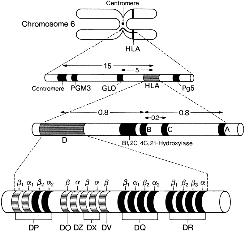locus. The epitopes of human MHC were first found on white blood cells and, therefore, were called human leukocyte antigen (HLA). Later these Ags were identified on virtually all nucleated cells throughout the body including cells in all three layers of the cornea.3 In the 1960s, the use of serologic reagents to identify transplantation Ags brought the HLA system into focus.4 By the end of the 1977 HLA workshop, it was known that three loci HLA-A, HLA-B and HLA-C controlled the production of a group of proteins that were called Class I Ag.5 Similar testing identified loci of the MHC in the mouse (H-2), rat (RT-I), chimpanzee (ChLA), rhesus monkey (RhLA), dog (DLAI), and numerous other species. The MHC is highly conserved throughout many mammals, and both animal and human studies aided in increasing the success of tissue and organ transplants. Microcytotoxicity testing to determine individuals' complete HLA genotype and computer codification of the reaction patterns of thousands of anti-HLA alloantisera have made possible the delineation of the entire HLA system. The Ags are reported centrally and updated monthly to the HLA sequence database held at the Anthony Nolan Research Institute.1 In 1973, HLA-B 27 was found to be associated with ankylosing spondylitis in a large proportion of cases, providing a second impetus for further study of the MHC. The motivation for defining HLA disease and association can help to determine at risk populations and genetic susceptibility factors. These may shed light on the mechanisms of disease, which include autoimmune, immune complex, and nonimmune, allowing for more precise strategies in disease prevention and treatment. In this chapter, nomenclature of the HLA system, genetic organization, biochemistry, and structure are reviewed. The historic and modern techniques of HLA typing are discussed, as well as the ophthalmic diseases associated with the HLA system. NOMENCLATURE The HLA region occupies a segment of DNA approximately 2 centimorgans (4 million base pairs) in length on the short arm of human chromosome 6.6 The centimorgan is a standard unit of physical map distance on a chromosome equivalent to a 1% frequency of genetic recombination between linked genes. The MHC contains numerous loci where individual genes may be found (Fig. 1). These intrinsic MHC loci are categorized into three classes, according to function (Table 1). With more sensitive serologic determination, many specificities have been refined and renamed. For example, DR5 was split into DR11 and DR12; B15 splits into B62, B63, B75, B76 and B77. The HLA Nomenclature Committee, governed by the World Health Organization, has met every 2 or 3 years to address the evolving knowledge and to come to agreements on the criteria used for defining serologic determinants. The problems with the complexity of the HLA nomenclature system has been evident since the first HLA workshop in 1964.7 New discoveries within the HLA system make it difficult to maintain organization of the nomenclature. A number of alleles named in error were renamed or abandoned.1,8 Currently identified alleles of each type include: 151 HLA-A, 301 HLA-B, 83 HLA-C (which are Class Ia—classical Class I Ags), 5 HLA-E, 1 HLA-F, 14 HLA-G (which are Class Ib—nonclassical Class I), 2 HLA-DRA, 281 HLA-DRB (D-related), 20 HLA-DQA, 43 HLA-DQB1 (formerly DS, MB, or DC), 18 HLA-DPA1, 87 HLA-DPB1 (formerly SB), 4 HLA-DMA, 6 HLA-DMB, 8 HLA-DOA, and 3 HLA DOB (which are Class II Ags). As of September 1999, a total of 1027 HLA alleles have been determined, and new alleles are updated monthly at a rate of about 150 alleles per year.1 The complete, updated database can be accessed on the Internet (www.anthonynolan.org). Additional loci continue to be recognized, and several are apparently silent (i.e., no gene product is produced). Despite its complexity, the HLA nomenclature system has been a prototype for naming genes in the Human Genome Project.7